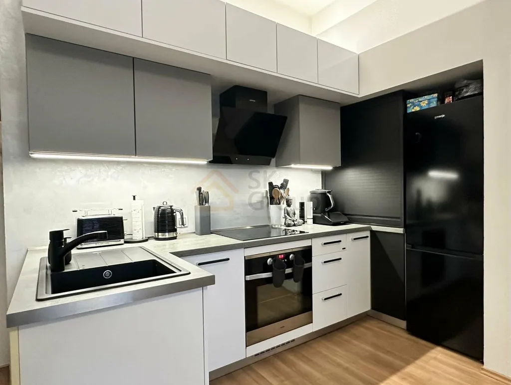 Dispozice bytu: vstupní chodba, obývací pokoj s moderní kuchyňskou linkou, vybavenou indukční varnou deskou, troubou, digestoří a myčkou. Z obývací části je vstup do samostatného pokoje, který aktuálně slouží jako ložnice a pracovna. Koupelna s WC se nachází hned u vstupu do bytu.