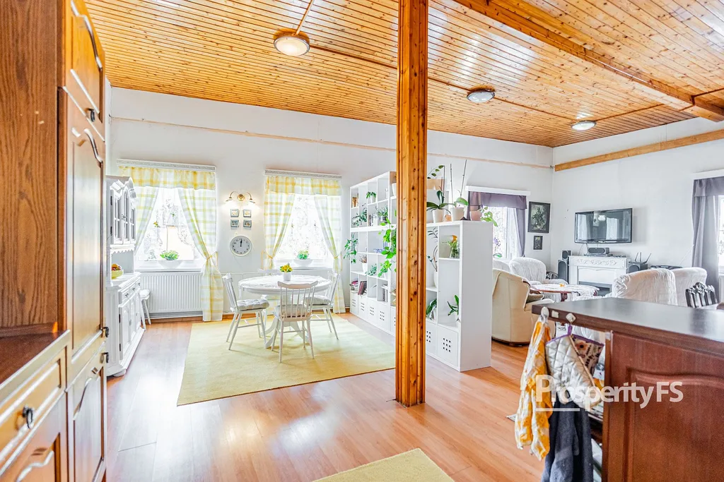 Prostor nabízí prostorný obývací pokoj s kuchyňským koutem, dvě samostatné neprůchozí místnosti a sociální zázemí. Díky své rozloze 162 m² nabízí interiér obrovský potenciál pro další úpravy podle představ nového majitele – ať už jako luxusní rezidenci, nebo kombinaci bydlení s vlastním kreativním studiem či kanceláří.