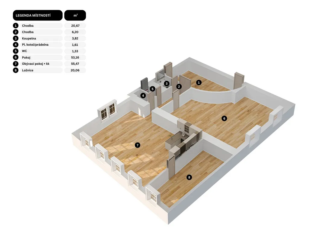 - Plocha a dispozice: Celkem 162 m² rozdělených do funkčního celku 3+kk.