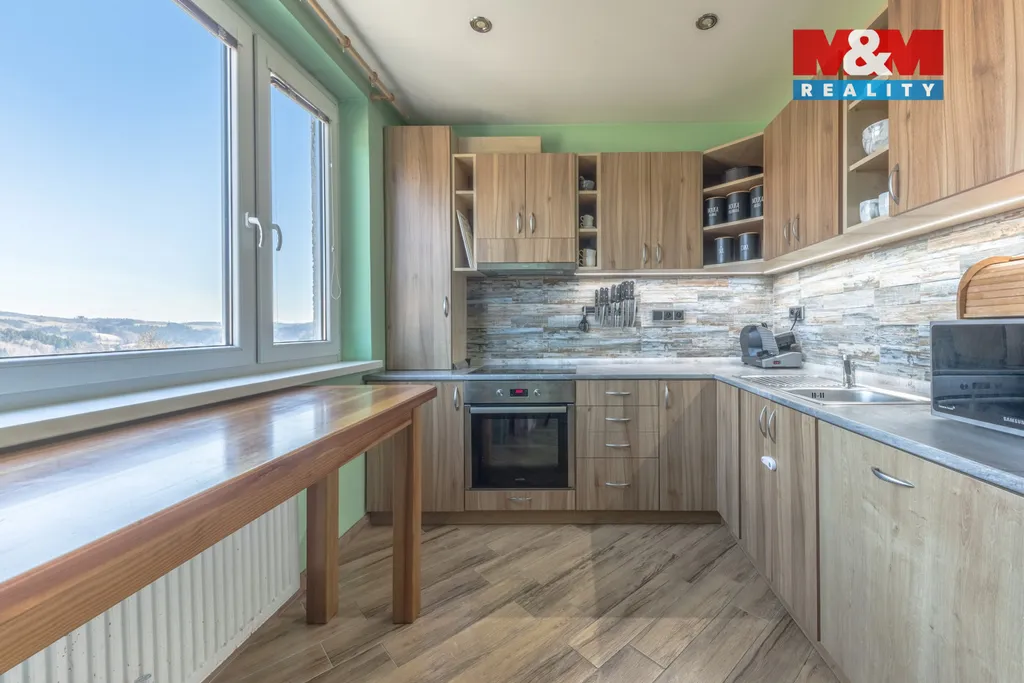 Nabízíme k prodeji krásný byt 2+1 ve Velkých Hamrech. Byt se nachází v posledním poschodí nejkrajnějšího vchodu místního sídliště a nabízí tak naprostý klid a překrásné výhledy do krajiny. Náleží k němu zasklená lodžie, dřevěná sklepní koje a společné prostory jako je kočárkárna, kolárna. Byt prošel rozsáhlou rekonstrukcí, vestavná kuchyně a skříně jsou součástí prodeje, zbytek po domluvě s majitelem. Dům byl revitalizován a díky úplně nové vlastní plynové kotelně jsou velmi nízké náklady na bydlení. Vhodné k trvalému bydlení, ale i k rekreaci jako horský apartmán, mnoho ski areálů v těsné blízkosti. Hledáte byt, který je klidný, ihned k nastěhování, nabízí úchvatné výhledy na místní kopce a s nízkými náklady na bydlení? Tak neváhejte a domluvte si prohlídku této výjimečné nabídky.