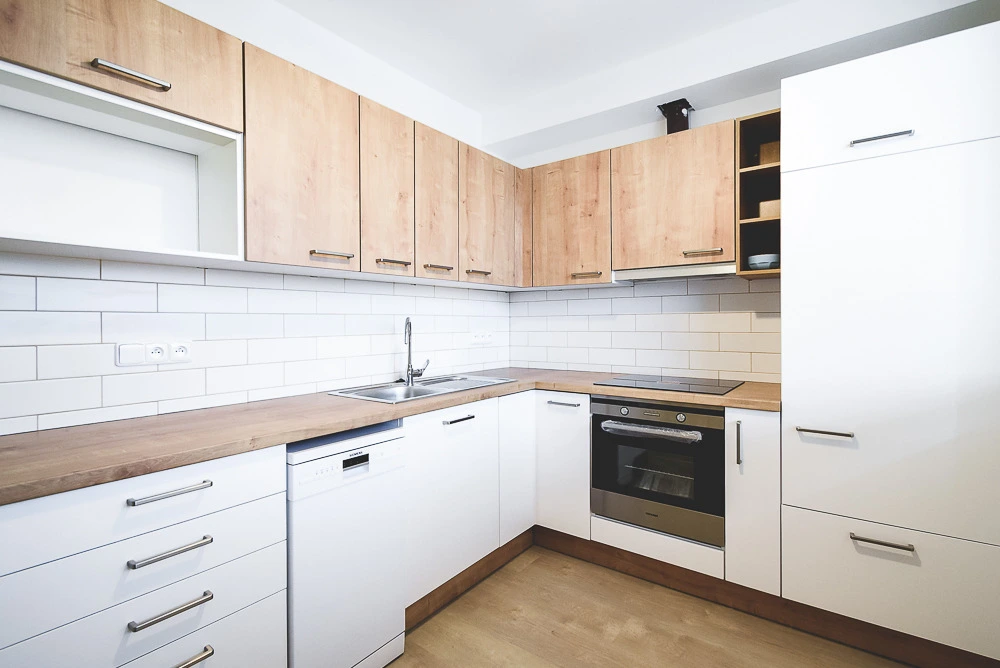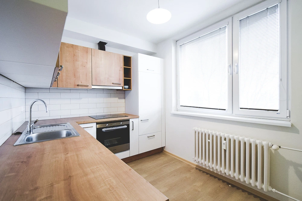 Byt se nabízí částečně vybavený. Prosvětlená kuchyňská linka disponuje lednicí s mrazákem, elektrickou troubou, sklo-keramickou indukční deskou, digestoří a myčkou. Ostatní pokoje jsou nevybavené a jsou neprůchozí. Nová koupelna je vybavena sprchovým koutem, umyvadlem se zrcadlem a toaletou. V bytě je k dispozici pračka a šatna jako místnost navíc.