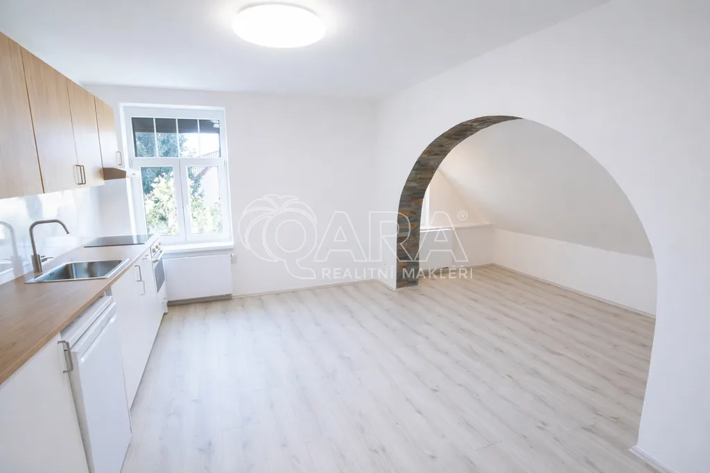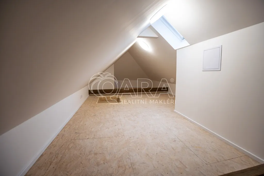 Dispozice bytu nabízí vstupní halu s úložným prostorem, světlý obývací pokoj s kuchyňským koutem, dvě neprůchozí ložnice a jeden průchozí pokoj, který může sloužit jako pracovna, šatna nebo další ložnice. Součástí je koupelna se sprchovým koutem, samostatné WC a praktický podkrovní prostor o velikosti 23 m², vhodný jako sklad, hobby místnost nebo herna.