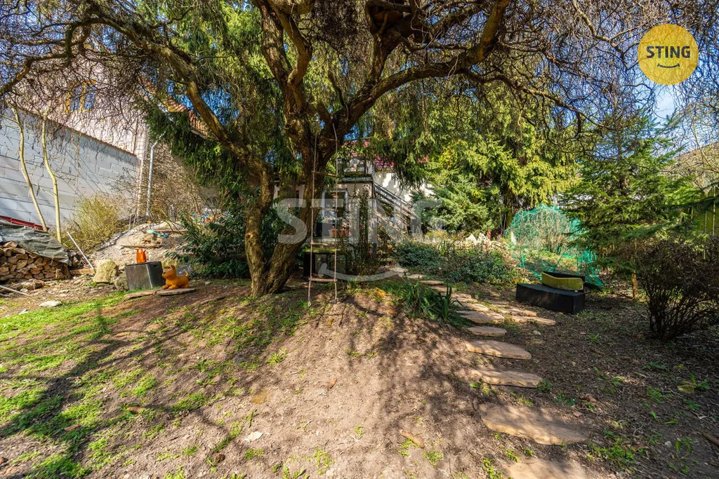 K domu náleží velkorysá zelená zahrada s dětským hřištěm, která nabízí dostatek soukromí.
