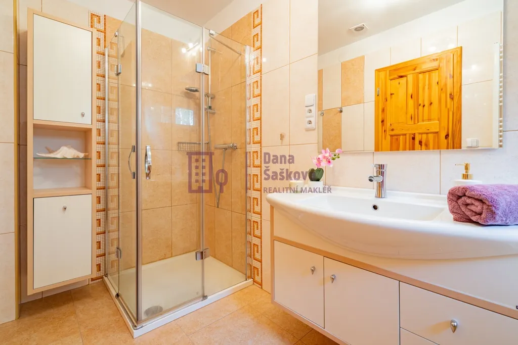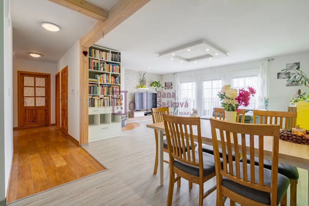 Obytná část s dispozicí 7+kk o ploše 181 m² + terasa 12 m2 nabízí velkoryse pojatý centrální prostor s obývákem a kuchyňským koutem, 4 ložnice, pracovnu, koupelnu se sprchovým koutem i vanou, další samostatnou toaletu, spíž, komoru a odpočinkový pokoj se saunou.