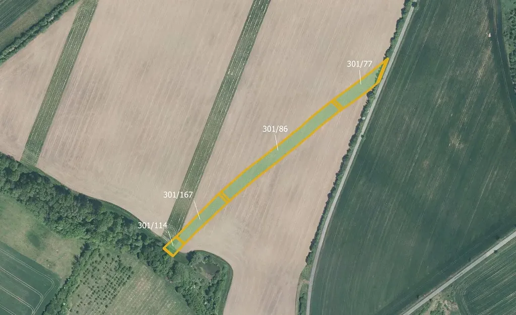 Pozemky jsou rozděleny na parcely č. 257, 301/38, 301/77, 301/86, 301/114, 301/115, 301/129, 301/160, 301/167, 301/172 a 695/36 v k. ú. Zdislavice a 418 v k. ú. Troubky, u obou KÚ se jedná o list vlastnictví 350.