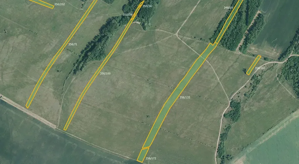 Předmětem prodeje je vlastnictví na parcelách 348/18, 348/27, 350/6, 350/7, 350/30, 350/38, 350/39, 353/8, 356/64, 356/71, 356/89, 356/92, 356/100, 356/133, 356/161, 356/172, 356/191, 356/202, 356/269, 376/24, 378/1, 383/45, 404/21, 404/33 a 413/26, zapsaných na LV č. 426, KÚ Hrubšice.