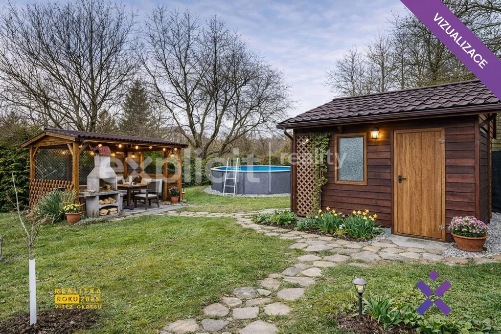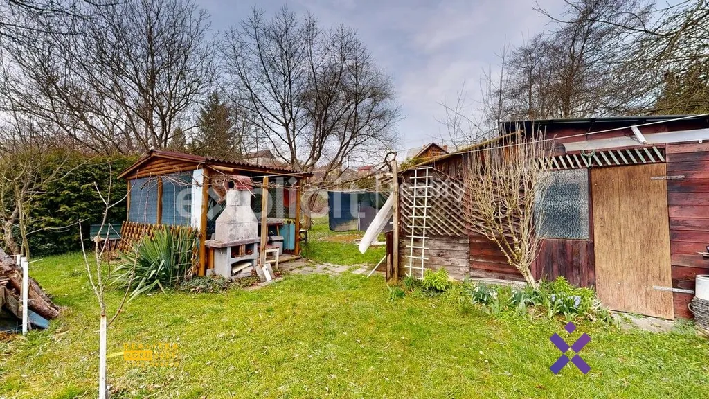 Součástí prodeje je dřevěná chatka s elektřinou a pergola s krbem. Zázemí je funkční, ale vyžaduje údržbu a vyklizení: