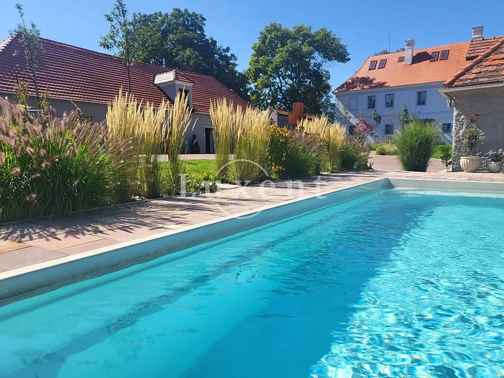 Prodej zahrnuje historickou zámeckou budovu s pěti ložnicemi a stylově zařízenými interiéry, dva butikové apartmány v samostatné budově, venkovní vyhřívaný bazén s protiproudem, soukromý rybník obklopený parkem a vodním domkem ideálním pro letní ubytování. Součástí areálu je také zámecká stodola s kapacitou až 70 míst, která byla precizně přizpůsobena pro pořádání různorodých akcí, jako jsou oslavy, vernisáže, přednášky či koncerty. Dále zde naleznete samostatnou garáž pro čtyři vozy, francouzskou bylinkovou a květinovou zahradu s okrasnými jezírky, romantické pergolové rozárium a nádvoří zdobené ústřední uměleckou plastikou.