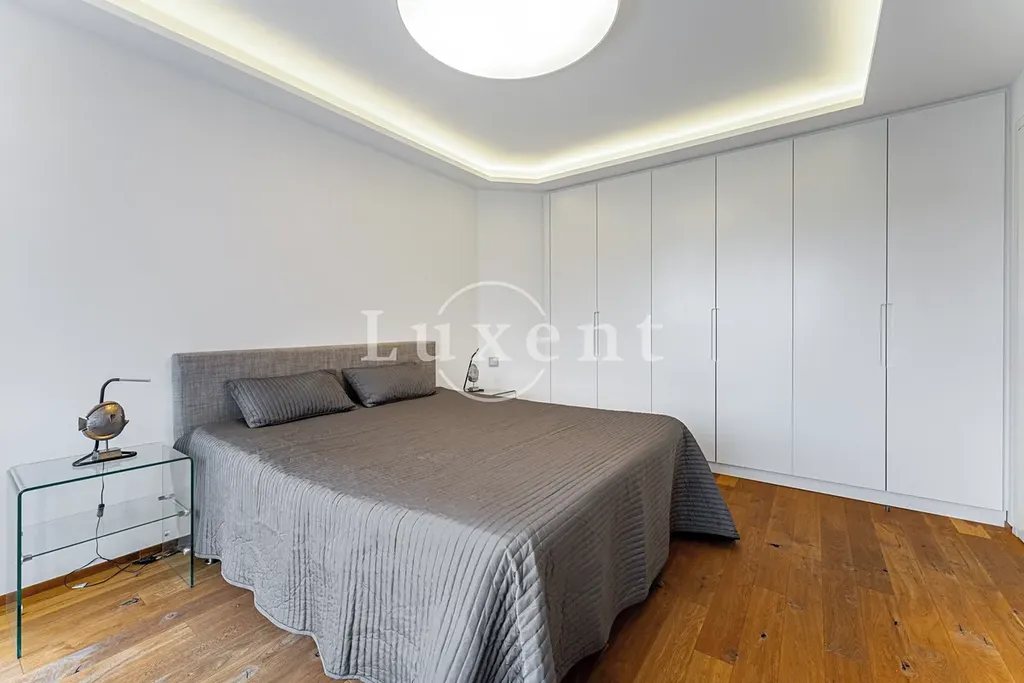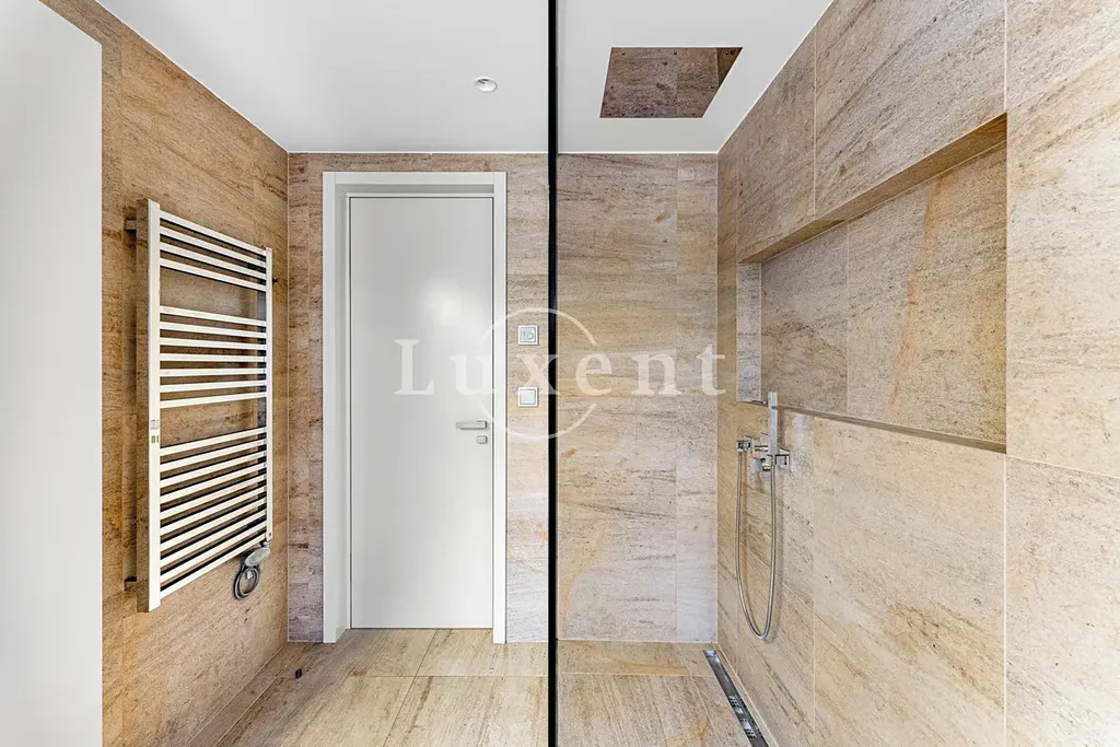 Ve spodní úrovni se nachází menší vstupní hala se schodištěm, vestavěnými skříněmi a vchody do dvou samostatných vybavených ložnic – obě s vestavěnými skříněmi. K hlavní ložnici patří navíc terasa s výhledem do klidného zeleného vnitrobloku.