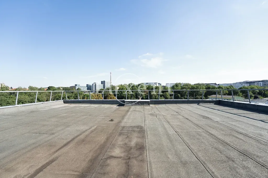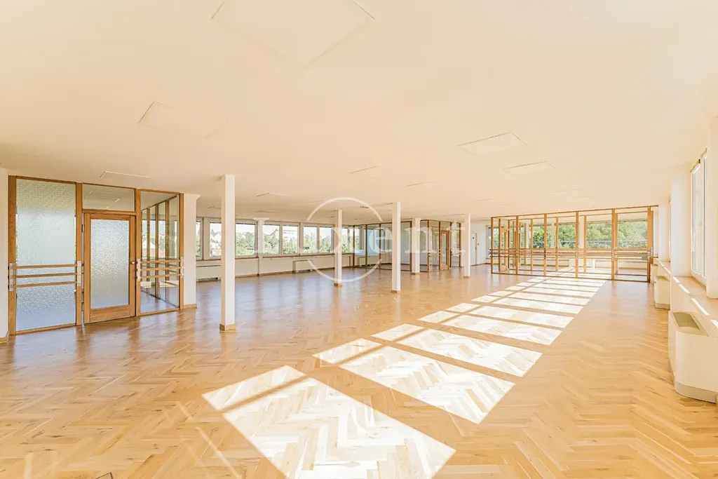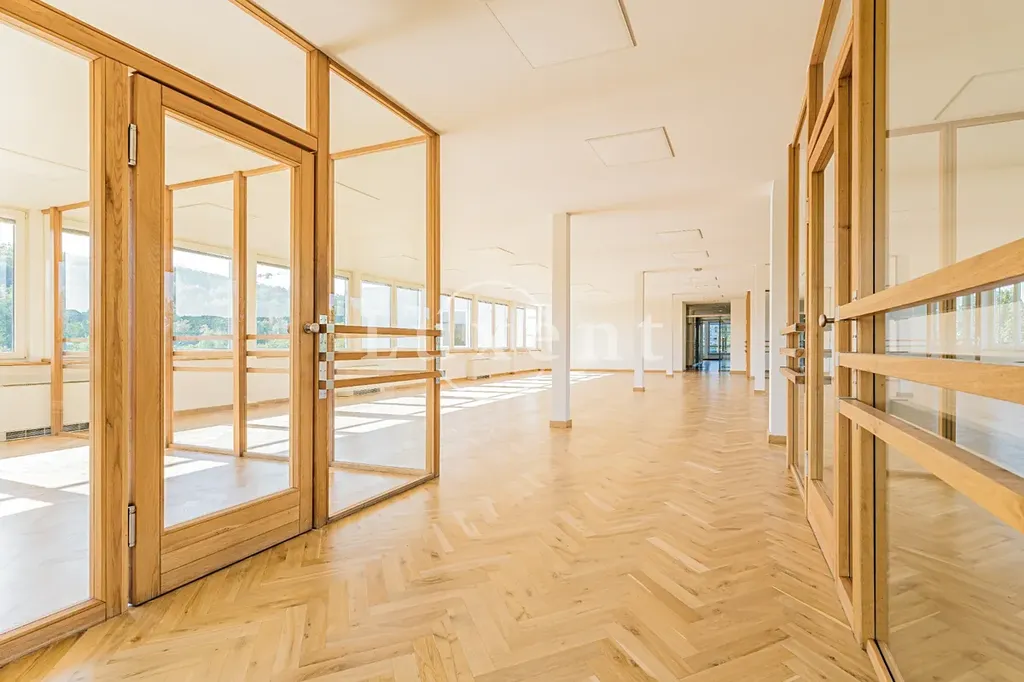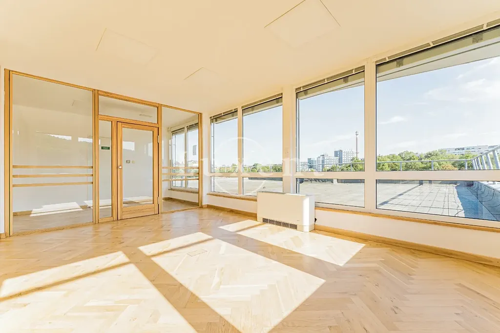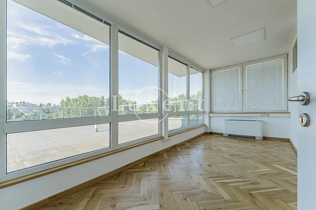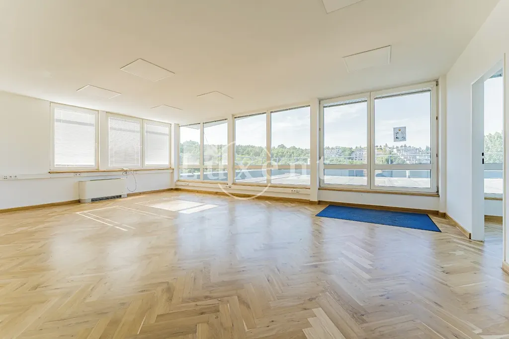 Kancelář se nachází v 5NP budovy s krásným výhledem do okolí, má terasu. Prostor skládá se z hlavního otevřeného prostoru 4 menších kanceláří oddělených skleněnými příčkami.