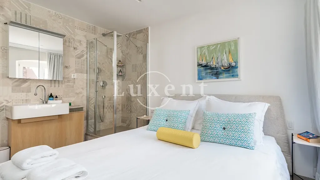 Obytná plocha o rozloze 120 m2 je rozložena na dvou podlažích a nabízí vyváženou kombinaci komfortního moderního bydlení a autentického středomořského stylu. V prvním patře se nachází vstupní hala s přirozeným denním světlem, stylový obývací pokoj s výhledem na centrum města, koupelna pro hosty a prostorná hlavní ložnice s vlastní en-suite koupelnou. Elegantně řešená kuchyně s vestavnými designovými spotřebiči plynule přechází do jídelní části, odkud prosklené dveře vedou na soukromou terasu s výhledem na moře. Tato terasa nabízí ideální prostor pro relaxaci, stolování pod širým nebem nebo příjemná setkání s přáteli.