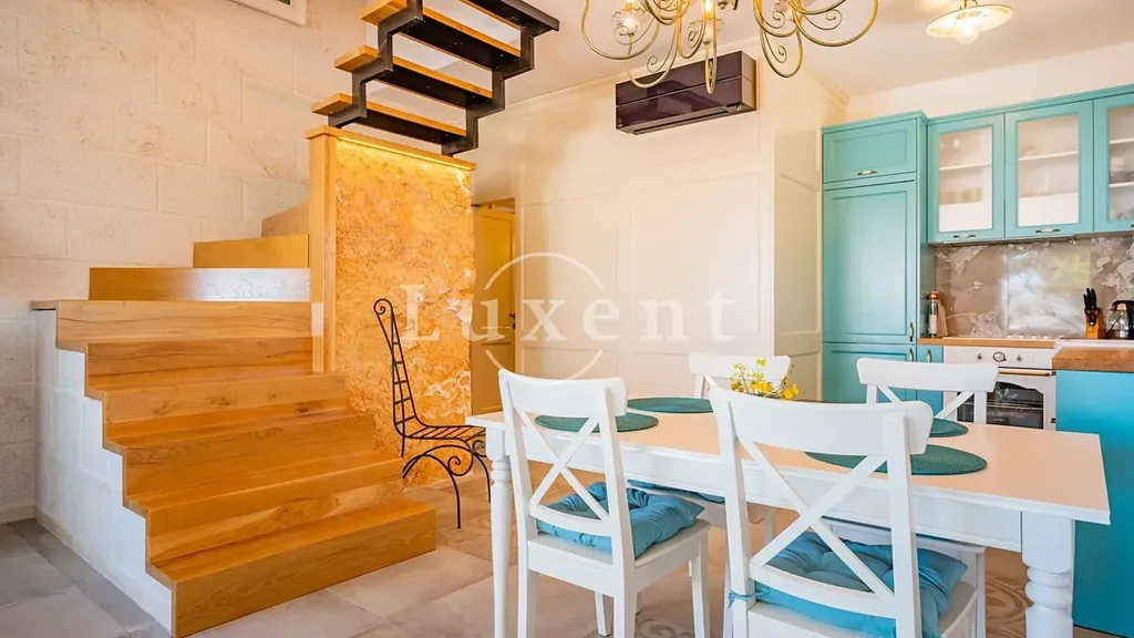 V horním patře se nacházejí dvě elegantně zařízené ložnice a moderní koupelna, která je vybavena hydromasážní vanou. Interiér je navržen s důrazem na detail, spojující moderní prvky s tradičním dalmatským stylem, což poskytuje maximální komfort a potěšení.