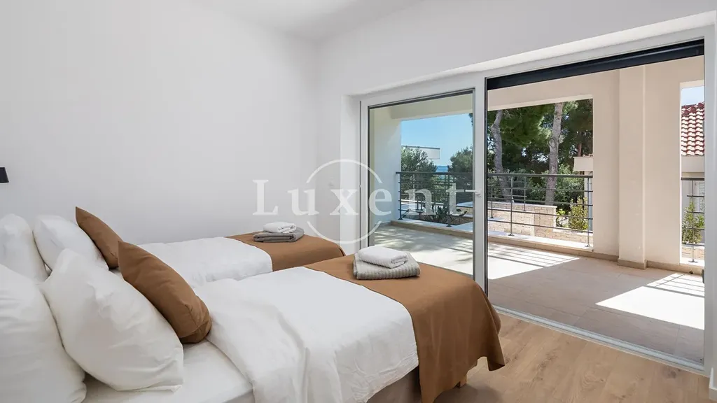 V prvním patře se nachází další dvě ložnice, každá opět s vlastní koupelnou, a hlavní terasa s nádherným výhledem na moře. K vile náleží také bazén, umístěný stranou pro maximální soukromí, a venkovní parkoviště pro několik vozidel. Celý pozemek je oplocen, což zajišťuje klid a soukromí i během letních měsíců.