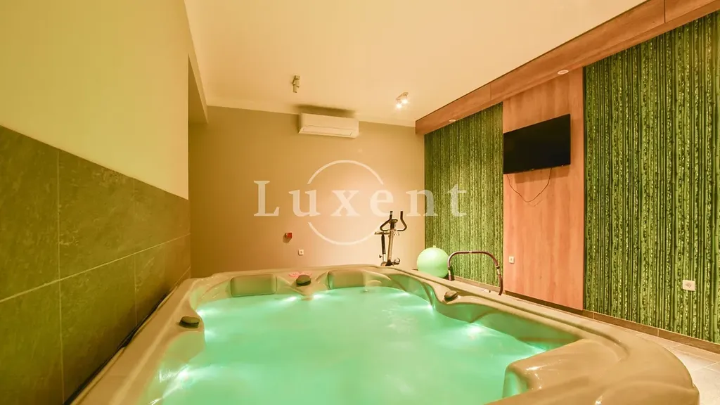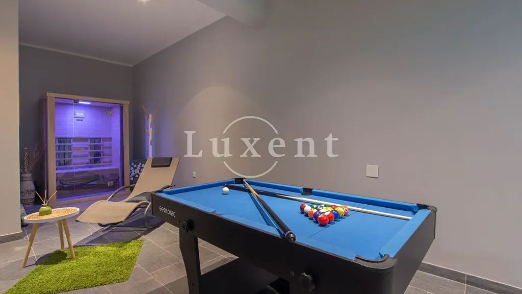 V přízemí vily se nachází wellness zóna se saunou, vířivkou a přímým vstupem k velkému vyhřívanému bazénu o rozloze 33 m2, který je obklopen prostornou sluneční terasou a zelení. Druhé podlaží nabízí komfortní ložnici s vlastní koupelnou, plně vybavenou kuchyň s jídelním koutem a prostorný obývací pokoj. Z něj se francouzskými okny vstupuje na venkovní terasu, odkud se otevírá úchvatný panoramatický výhled na moře a okolní přírodu. Třetí podlaží je navrženo jako klidová zóna se čtyřmi samostatnými ložnicemi, každá s vlastní koupelnou, což zajišťuje absolutní pohodlí pro větší rodinu nebo skupinu hostů.