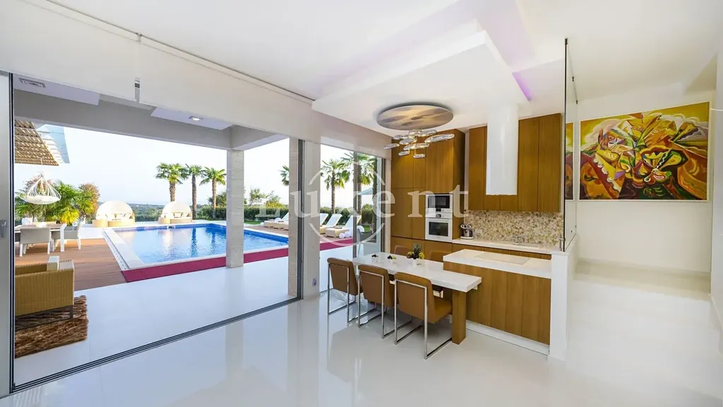 Vila o celkové obytné ploše 250 m2 je rozložena do dvou podlaží a umístěna na prostorném pozemku o rozloze 962 m2. Její elegantní bílá fasáda a čisté architektonické linie podtrhují moderní vzhled, který se harmonicky doplňuje s přírodním prostředím a klasickým středomořským dvorem plným květin a upravené zeleně.