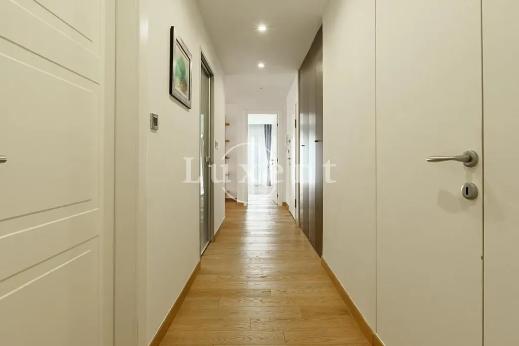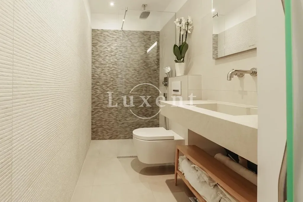 Tento prostorný a kompletně zrekonstruovaný apartmán o velikosti 108 m2 se nachází v sedmém patře moderního bytového domu s výtahem. Je orientován na východ, sever a západ, což zajišťuje dostatek denního světla po celý den. Dispozice zahrnuje vstupní halu, chodbu, hlavní koupelnu, technickou místnost, prádelnu, tři ložnice – přičemž hlavní ložnice má vlastní en-suite koupelnu – dále moderní kuchyni propojenou s jídelnou a obývacím pokojem, odkud je přímý vstup na prostorný balkon s nádherným otevřeným výhledem na moře.