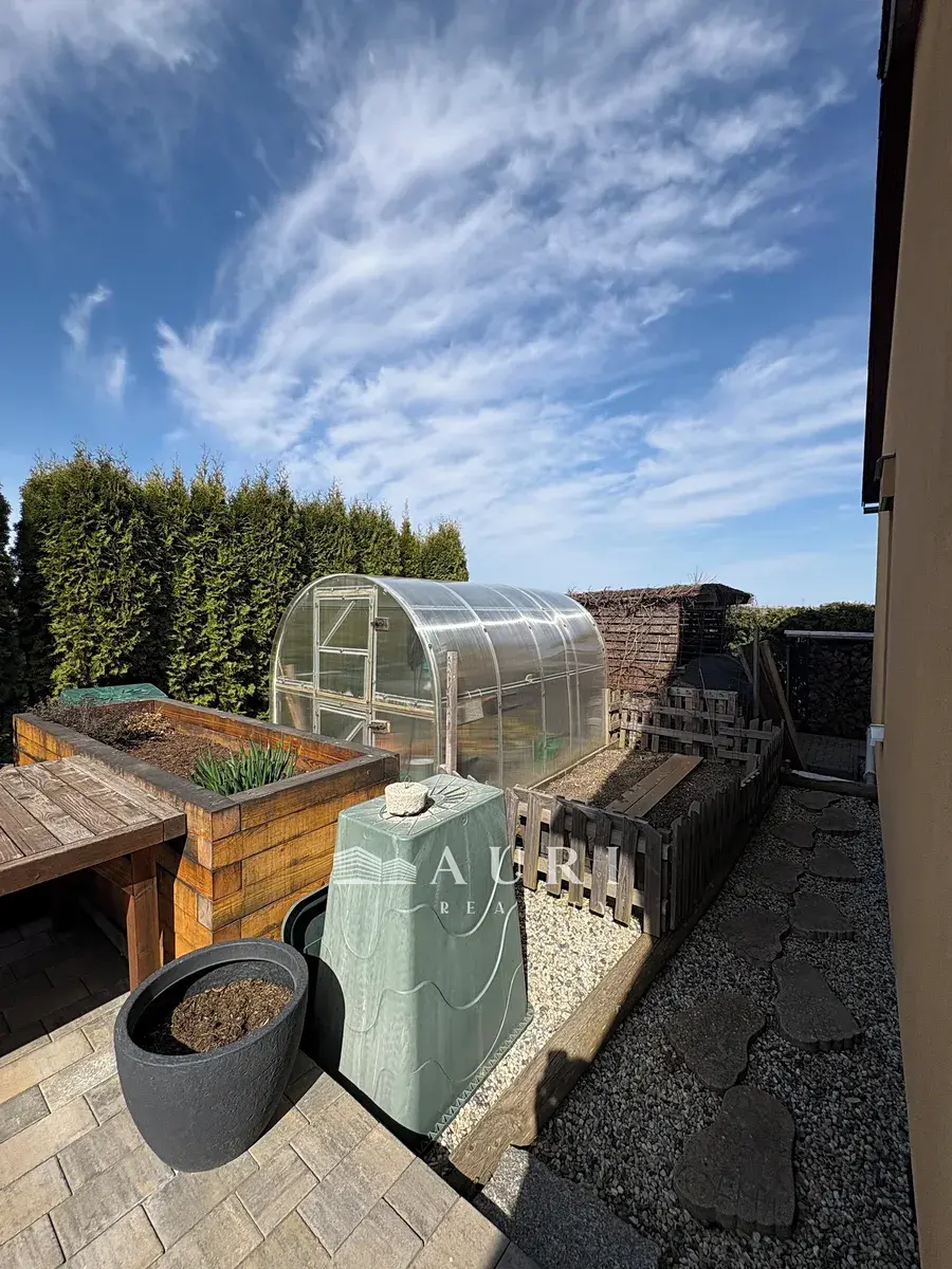 Dispozice domu zahrnuje prostorný obývací pokoj s kuchyní a špajzem, ložnici, pokoj a dvě koupelny. Příjemnou atmosféru interiéru dotváří krbová vložka a zimní zahrada.