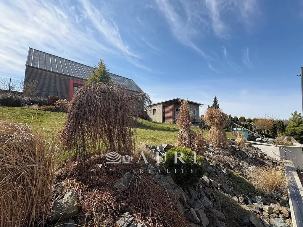Součástí nemovitosti je také bazén, dva zahradní domky a dřevník. Zahrada je osázena okrasnými stromy a doplněna velmi poutavou skalkou, která celému exteriéru dodává osobitý a harmonický charakter.