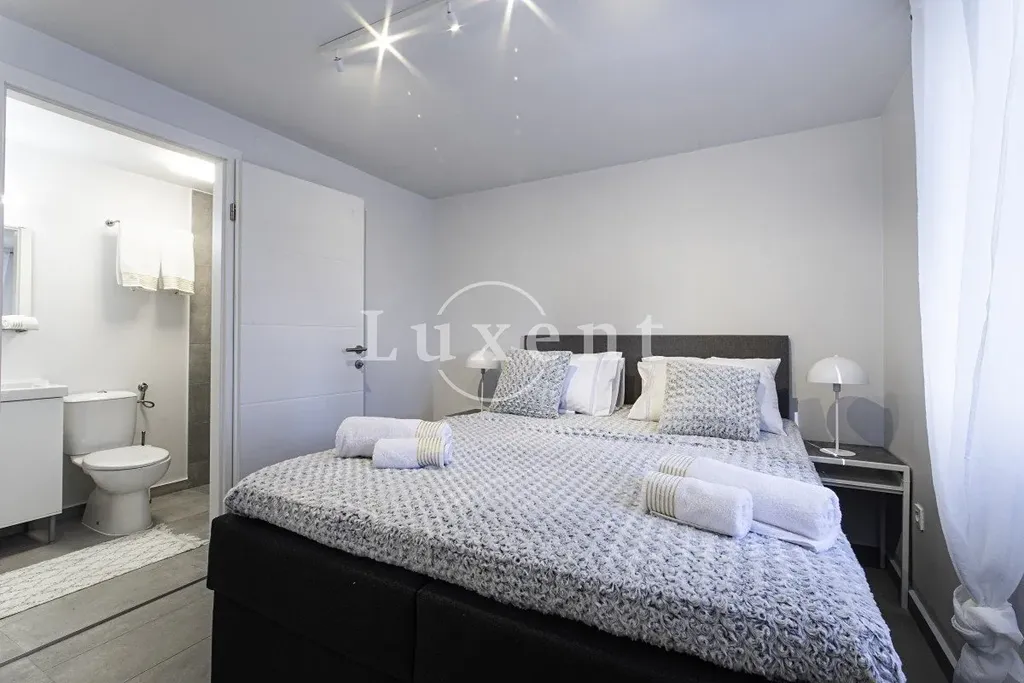 Interiér domu je laděn v moderním stylu s důrazem na čisté linie, funkčnost a pohodlí. Každé podlaží je prosvětlené denním světlem a z vyšších pater se otevírá krásný výhled na moře. Exteriér doplňuje parkovací zázemí s dostatkem prostoru pro několik vozidel. Dům představuje ideální příležitost pro komfortní rodinné bydlení, výnosnou turistickou investici nebo kombinaci soukromého a podnikatelského využití.
