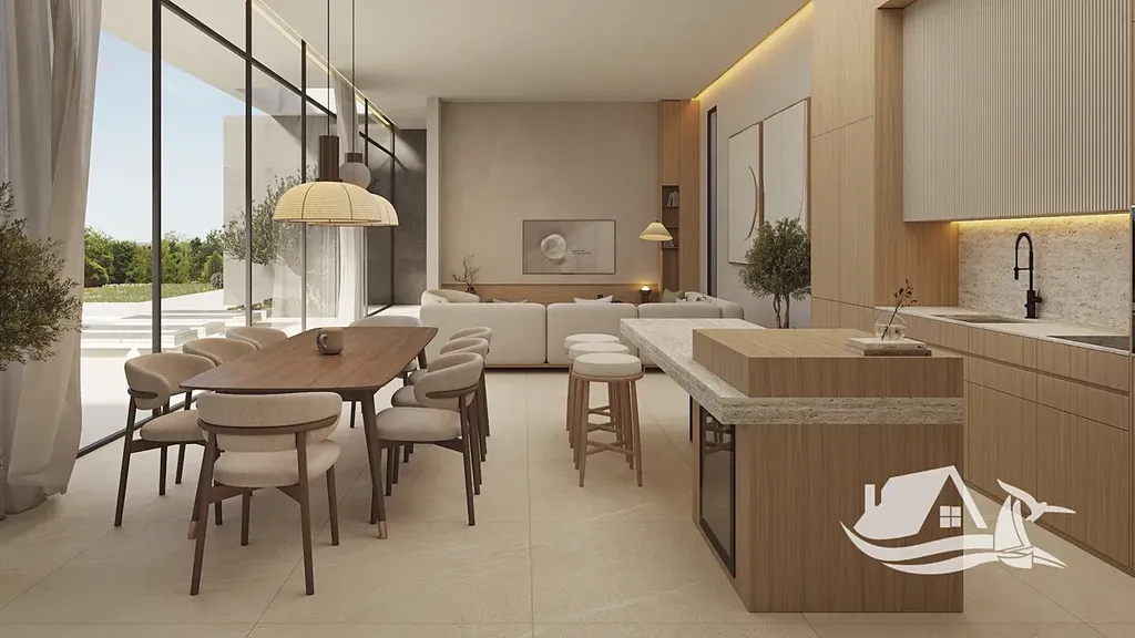 Exteriér domu je navržen tak, aby maximálně využil středomořské klima. Krytá terasa o velikosti 20,64 m² a otevřená terasa o rozloze 33,17 m² poskytují ideální prostor pro venkovní posezení, stolování i relaxaci. Soukromý bazén o velikosti 52,50 m² se stává dominantou zahrady a místem, kde si užijete horké letní dny i klidné večery. Solárium přináší další úroveň odpočinku a výhledů, zatímco pergola vytváří příjemné zastínění.