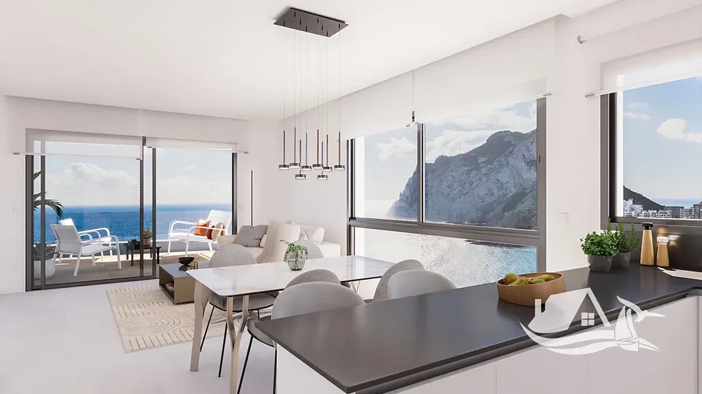 Apartmán o celkové ploše 112,16 m² a užitné ploše 74,81 m² je navržen s důrazem na světlo, prostor a funkčnost. Dominantou je obývací pokoj propojený s kuchyní, který plynule navazuje na prostornou terasu o velikosti 28,15 m². Druhá venkovní část v podobě balkonu o rozloze 7,15 m² doplňuje celkový komfort a nabízí další úhel pohledu na okolí. Jedna terasa směřuje k moři a ikonické skále Peñón de Ifach, druhá nabízí klidnější výhled na solné laguny Calpe. Dvě ložnice poskytují dostatek soukromí a koupelna je řešena moderně a prakticky. Součástí je také sklep a vlastní parkovací místo.