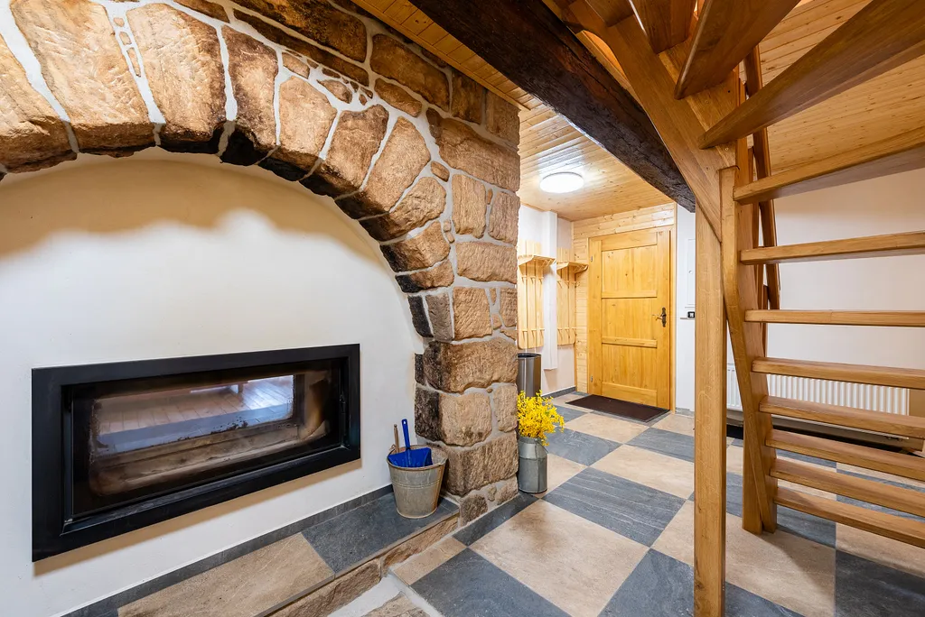 Dominantou domu je renovovaný pískovcový komín s oboustrannou krbovou vložkou, který tvoří přirozené srdce celého prostoru.