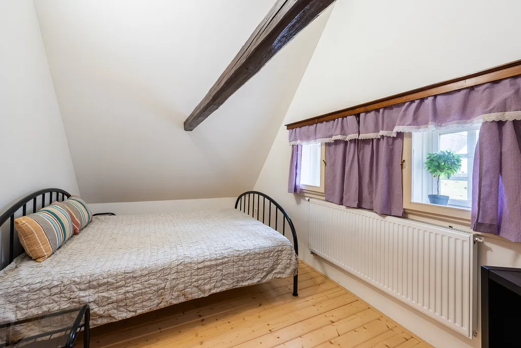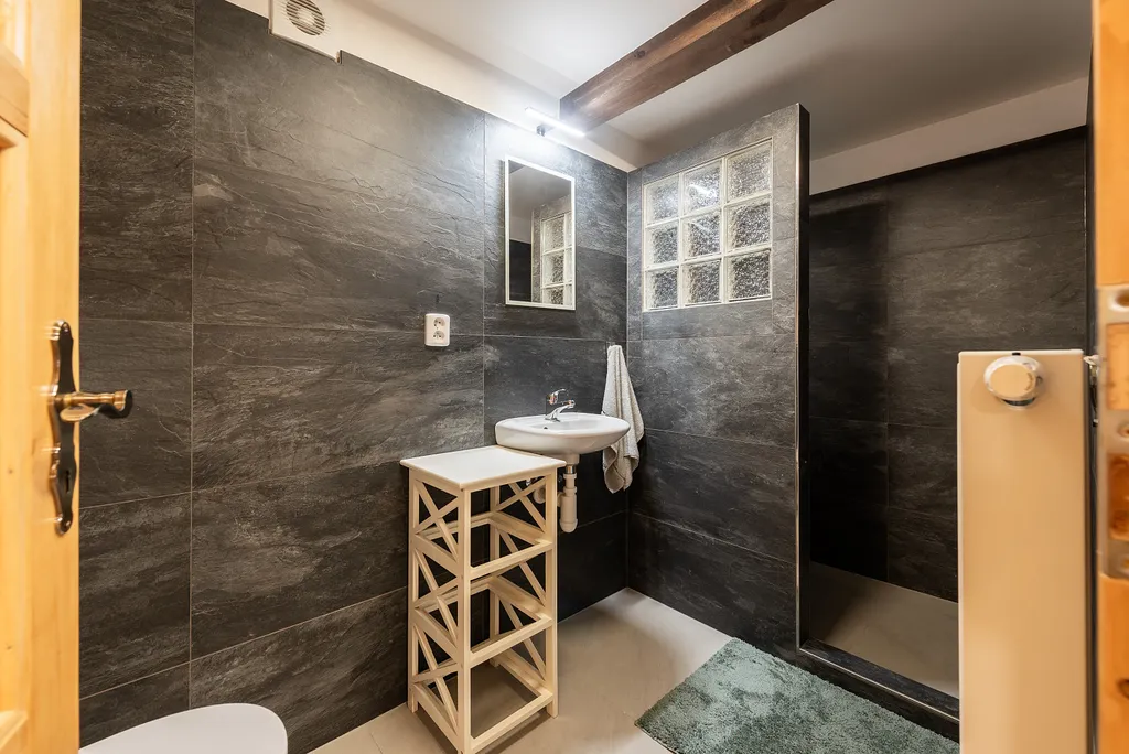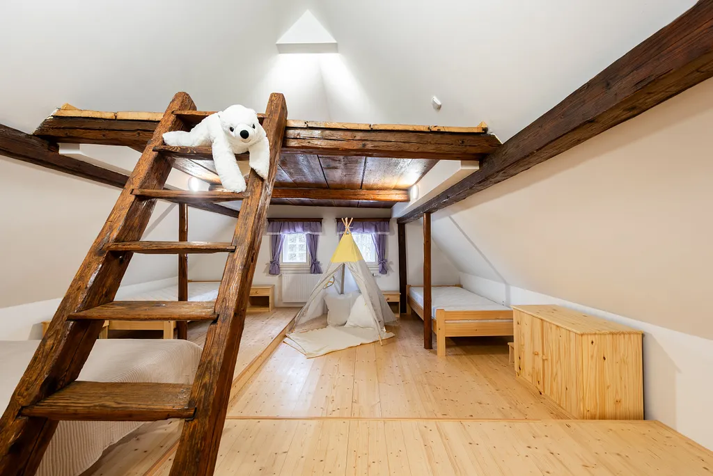 Do podkroví vede masivní dřevěné schodiště, které ústí do prostorné haly s přípravou na druhou kuchyň. Podkroví dále nabízí druhou koupelnu, dvě samostatné ložnice a velkorysý otevřený prostor s přiznanými trámy, který je ideální jako dětský pokoj, herna nebo odpočinková zóna.