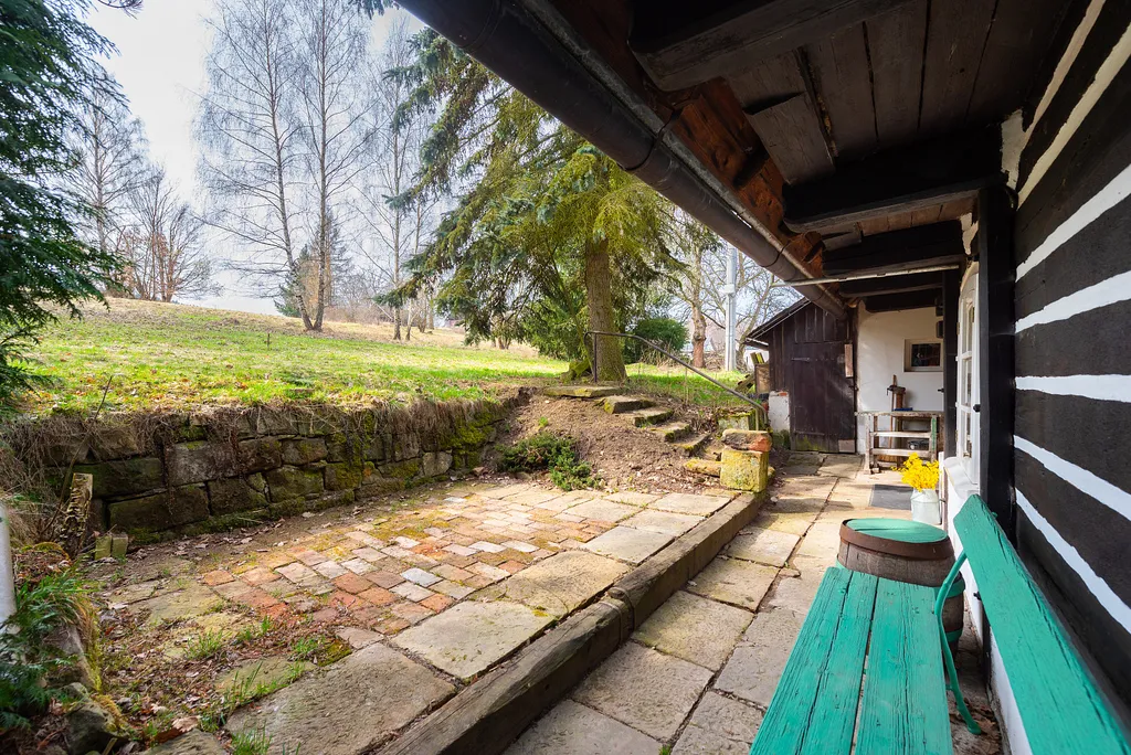 Na dům navazuje mírně svažitá zahrada, kde se nachází původní kamenné zápraží s dlážděným dvorkem a opěrnou kamennou zídkou. Tento prostor vytváří přirozené venkovní posezení a podtrhuje venkovský charakter celé nemovitosti.