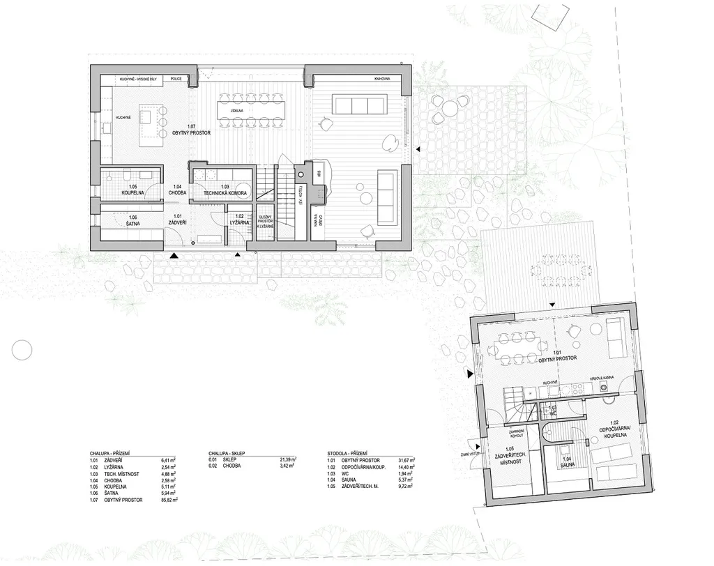 Majitel má k dispozici stavební projekt na realizace domu a domu pro hosty. viz vizualice a stavební povolení platné do 12/2027.