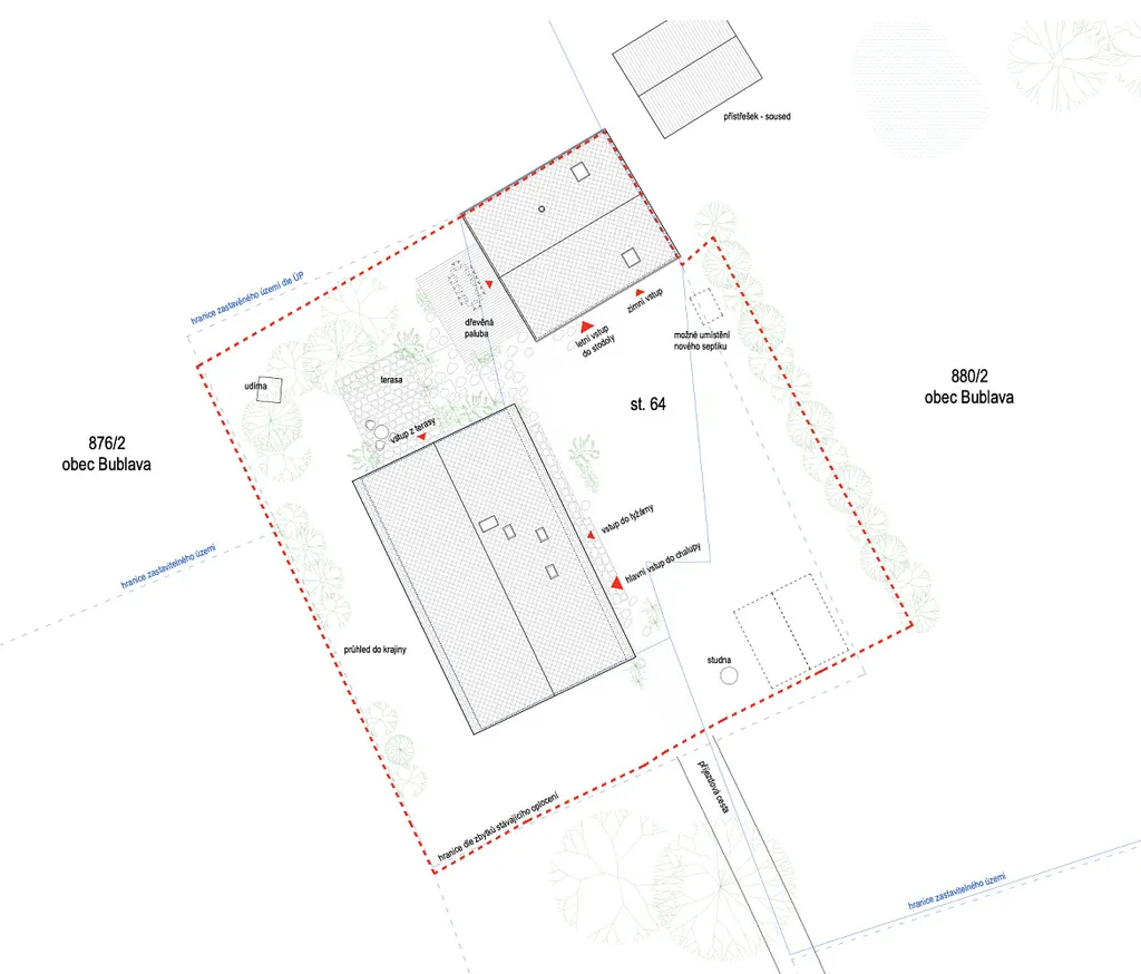 Součástí nabídky je projekt stavebních úprav, který si nechali zpracovat současný vlastník. Kupující tak může navázat na již připravený záměr, nebo realizovat vlastní představu o využití pozemku. Dále je na pozemku platné stavební povolení do 12/2027.