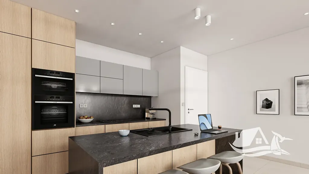 Apartmán disponuje promyšlenou dispozicí s otevřeným obývacím prostorem, plně vybavenou kuchyní a vstupem na 3 balkony, které rozšiřují obytný prostor a nabízí ideální místo pro relaxaci či venkovní stolování. Součástí je vlastní parkovací stání a sklepní kóje.