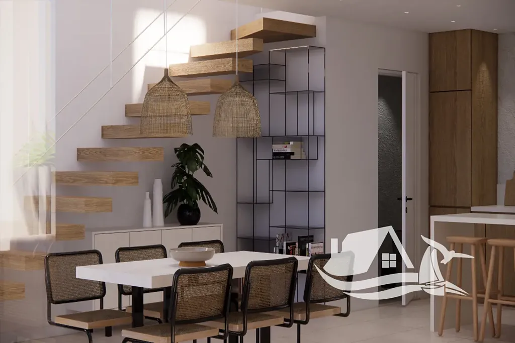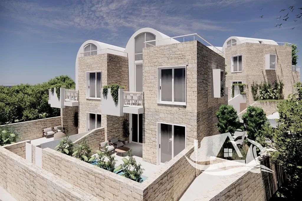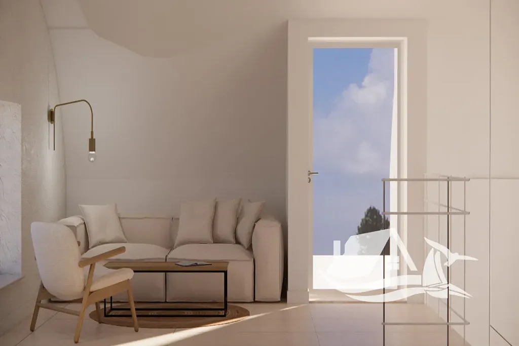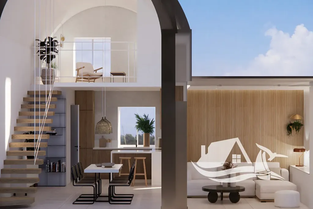 Přízemí nabízí přímý vstup na soukromé patio a zahradu, ideální pro ranní kávu či večerní relaxaci. První patro zahrnuje elegantní obývací prostor se vstupem na dvě soukromé terasy, plně vybavenou otevřenou kuchyni a koupelnu. Vzdušný mezanin, propojený plovoucím schodištěm, nabízí panoramatický výhled na moře a přístup na prostornou střešní terasu, ideální pro posezení při západu slunce.