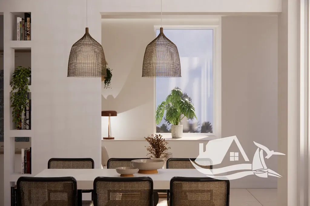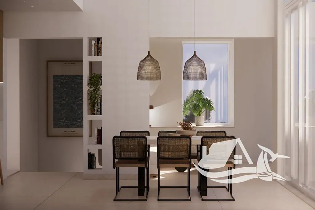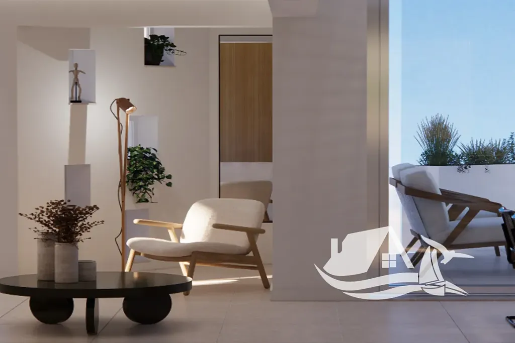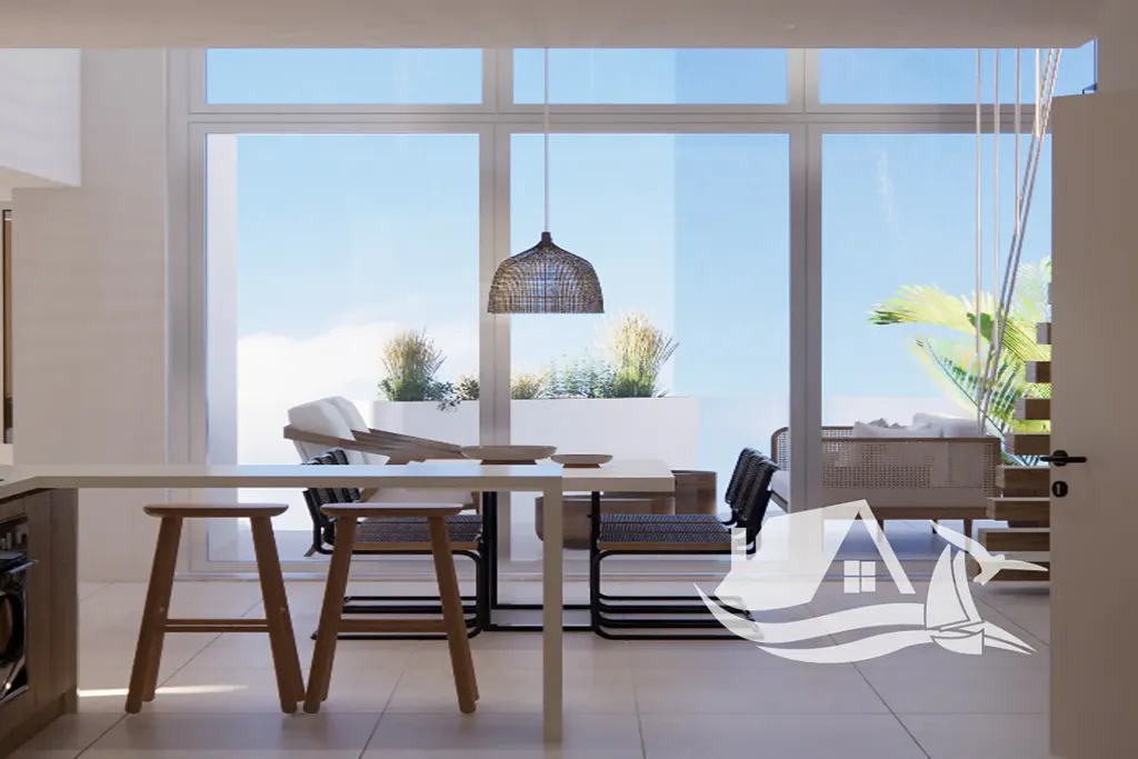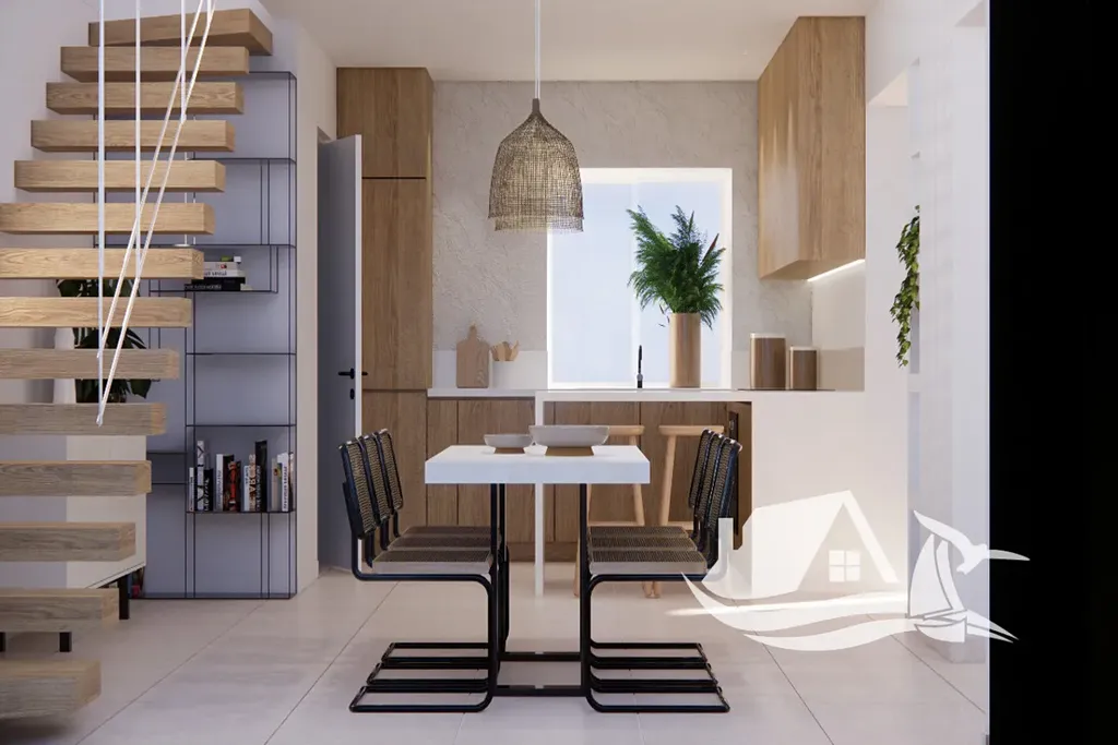 Přízemí nabízí přímý vstup na soukromé patio a zahradu, ideální pro ranní kávu či večerní relaxaci. První patro zahrnuje elegantní obývací prostor se vstupem na dvě soukromé terasy, plně vybavenou otevřenou kuchyni a koupelnu. Vzdušný mezanin, propojený plovoucím schodištěm, nabízí panoramatický výhled na moře a přístup na prostornou střešní terasu, ideální pro posezení při západu slunce.