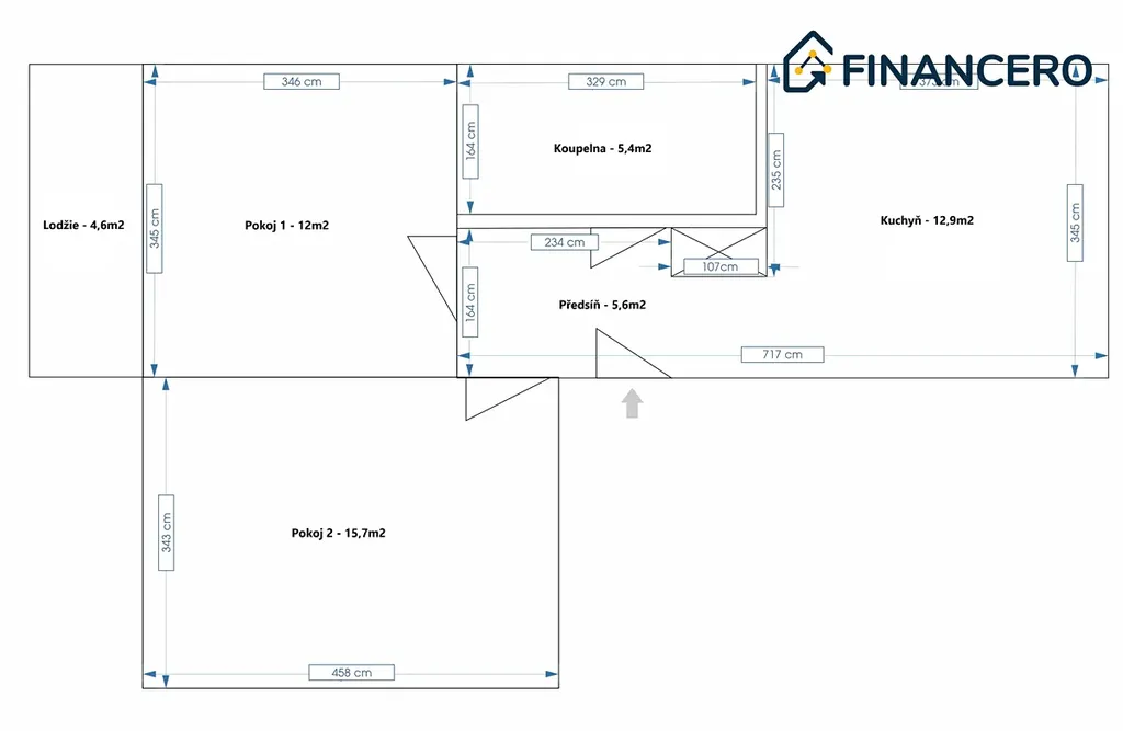 Byt o celkové výměře 58 m2 se nachází v 2. NP z celkových 6 NP. Byt se skládá ze dvou pokojů (12 m2 a 15,7 m2), kuchyně (12,9 m2), předsíně (5,6 m2)a koupelny s WC (5,4 m2). K bytu náleží zasklená lodžie (4,6 m2), sklepní kóje (1,7 m2) a kočárkárna. V přiloženém půdorysu bytu je vidět uspořádání místností. Byt je nově vymalovaný.