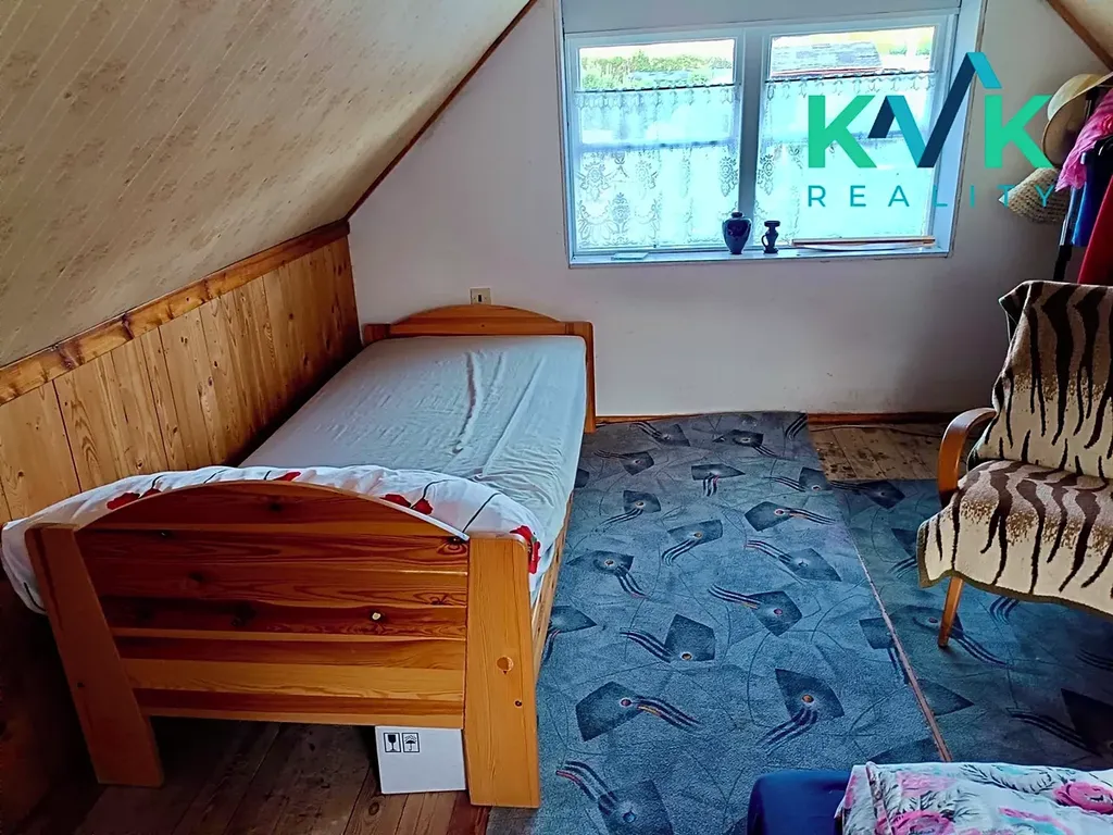 V přízemí se nachází kuchyňská linka, spaní je řešeno v podkroví. Součástí je komín připravený k instalaci kamen, což umožňuje vytápění a prodloužení sezóny užívání.