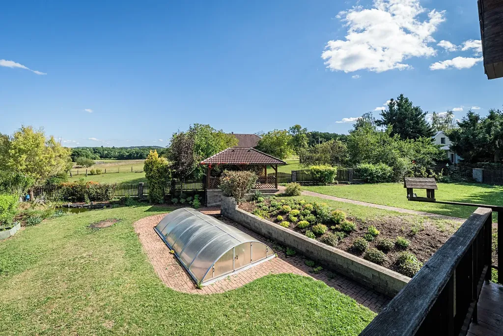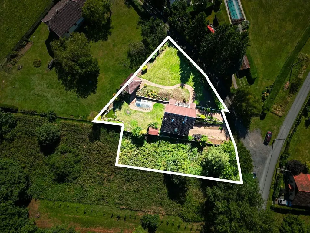 Příjemnou atmosféru při výhledech z domu, nebo při posezení na terase dotváří udržovaná zahrada nepravidelného tvaru o výměře 1195m2.