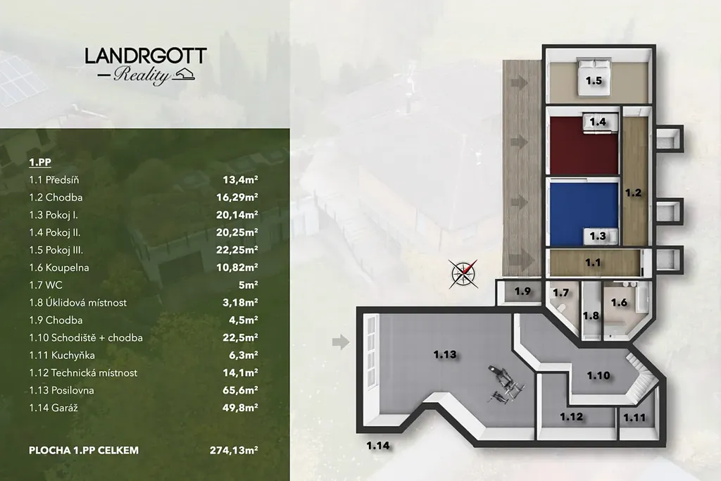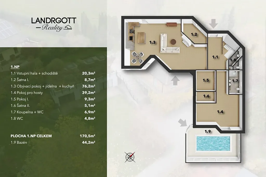 Dům má užitnou plochu 600 m², pozemek o velikosti 2008 m² a zahradu 1585 m².