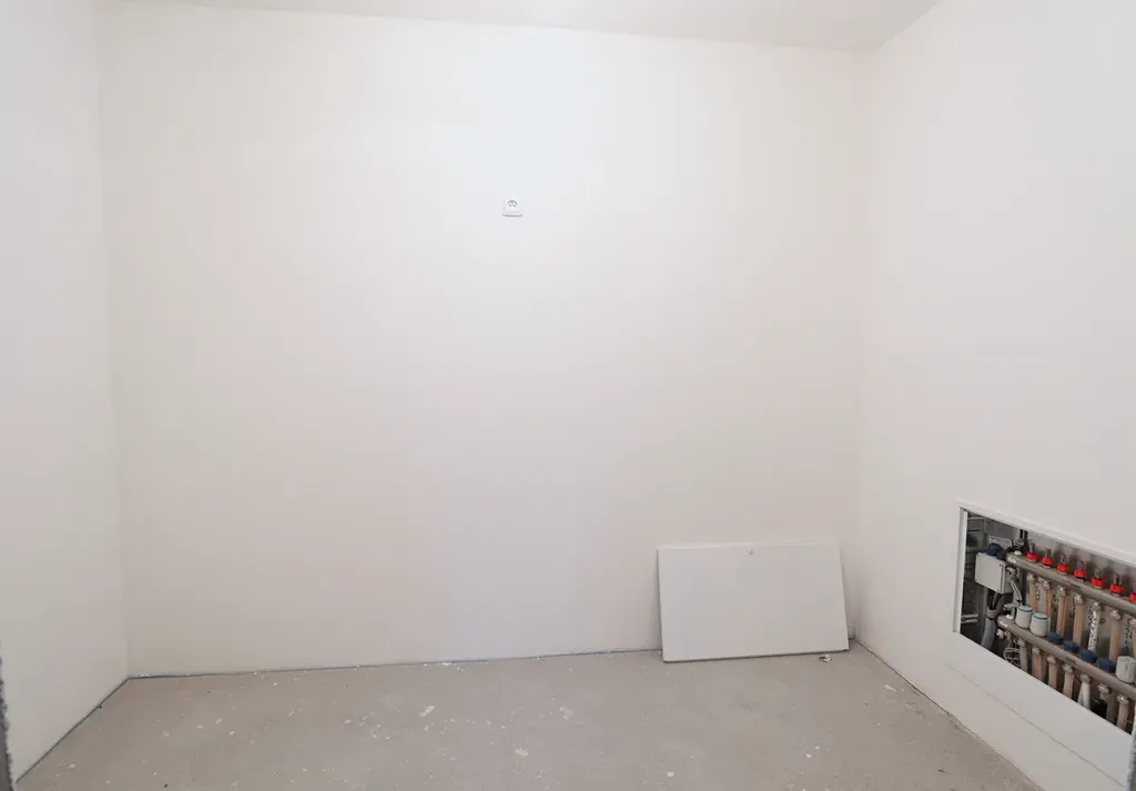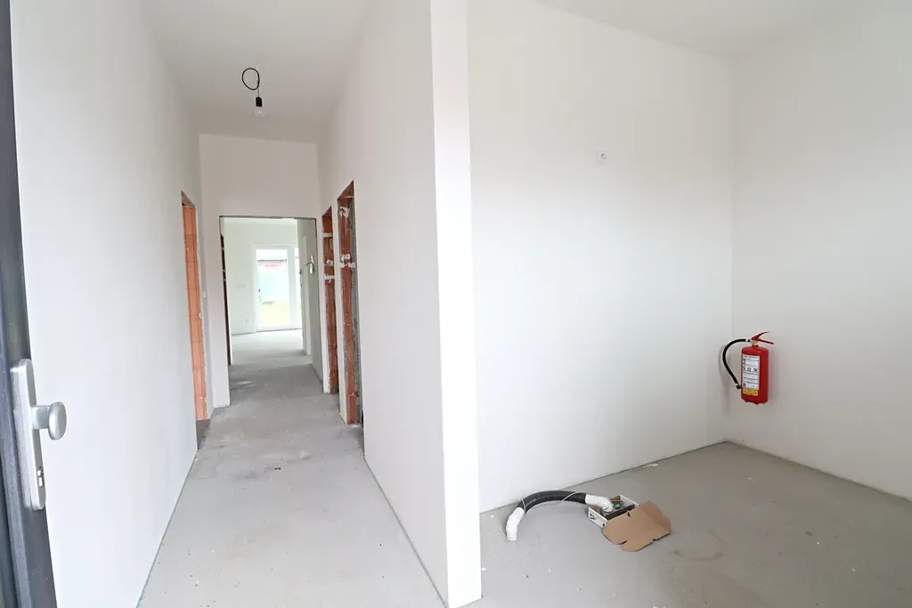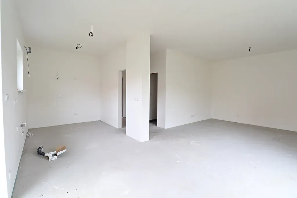Světlý obývací pokoj propojený s budoucím kuchyňským koutem – ideální místo pro rodinné chvíle.