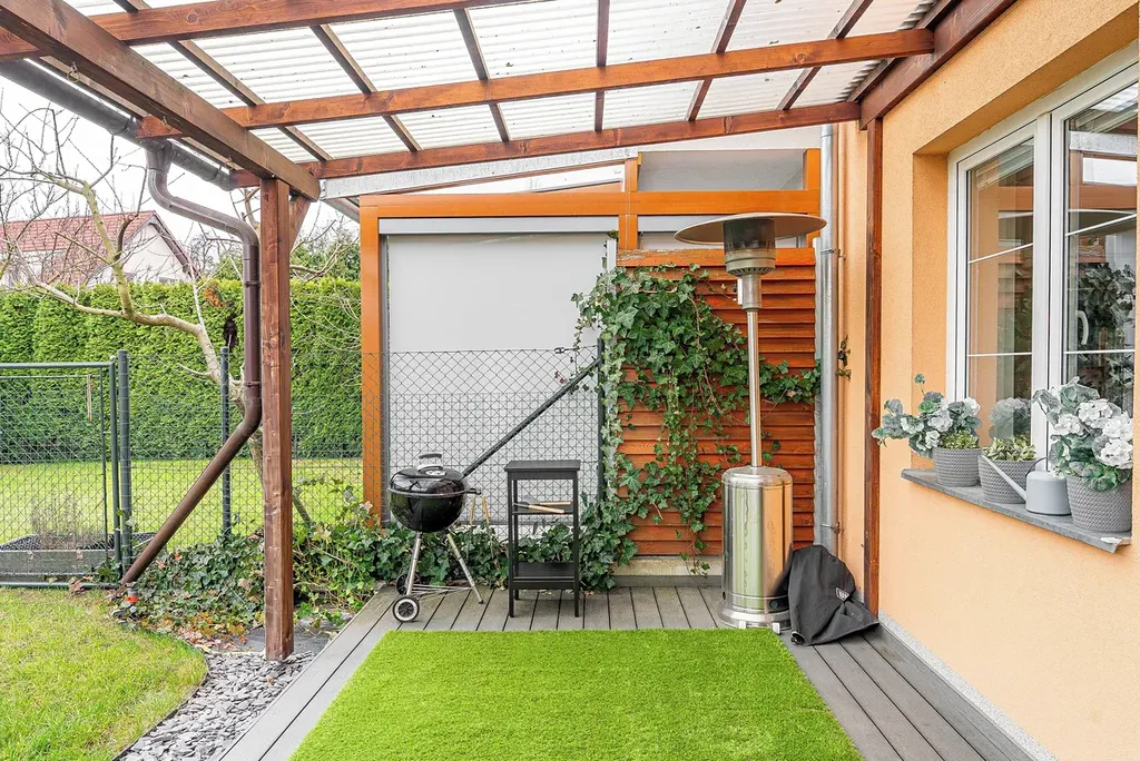 Na obytný prostor navazuje prakticky řešená zahrada, která je plnohodnotným pokračováním domu. Pergola poskytuje příjemný stín v letních měsících, zahradní domek nabízí zázemí pro uložení věcí a celý prostor je připraven i pro případné doplnění bazénu nebo sauny.