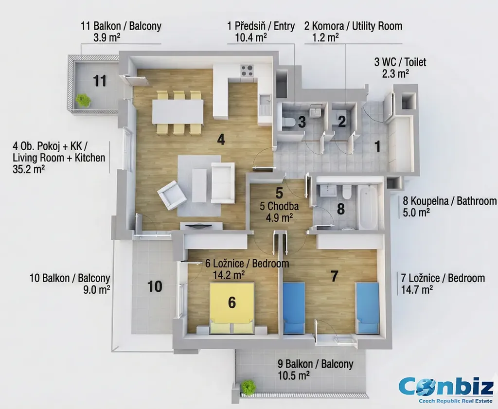 Nabízíme Vám k prodeji krásný byt 3kk, 87,9 m2, byt má tři balkony, v novostavbě Rezidence Modřanka, pár kroků od přírody, pár zastávek od centra. Byt o velikosti 87,9 m2 + balkony 10,5 m2, 9,0 m2, 3,9 m2 + garážové stání + sklep. Garážové stání a sklep je v ceně 1.000.000 Kč a jsou součástí prodeje. Celková cena tedy činí 14.900.000 Kč. Byt se nachází v 10. patře domu a je vybaven kuchyňskou linkou se sklokeramickou varnou deskou, elektrickou troubou a myčkou, koupelnou s vanou, umyvadlem, toaletou zvlášť. Ze všech pokojů je vstup na balkon s krásným výhledem kolem domu. Na podlahách je dřevěná podlaha, v předsíni a koupelně je keramická dlažba. U domu je dětské hřiště, klidné posezení ve vnitrobloku. Byt je vhodný pro bydlení, ale i pro investici. Přímo před rezidencí je autobusová zastávka Cukrovar Modřany, 5 min. dochozí vzdálenosti tramvaj Nádraží Modřany a vlak. Ve vzdálenosti 10 min. autem obchodní centrum Novodvorská Plaza.