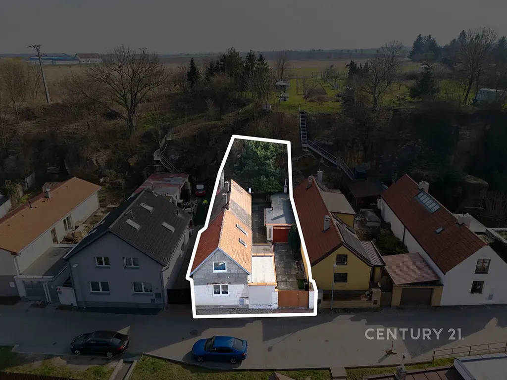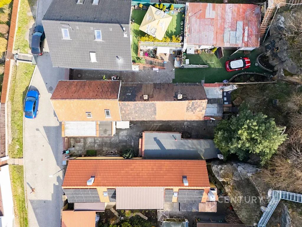 Pozemek je zastavěný, součástí je garáž s plechovými vraty, dílna a sklep uvnitř pískovcové skály, která tvoří hranici pozemku. Celková výměra pozemku (zastavěná plocha a nádvoří) je 409 m².