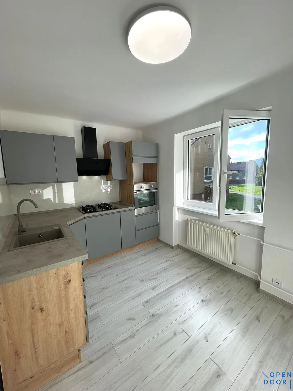 Byt prošel kompletní rekonstrukcí (podlahy, plastová okna, interiérové dveře vč. obložek, nové rozvody elektřiny, vody a odpadů) a je připraven k okamžitému nastěhování. Kuchyňská linka ve tvaru "L" je provedena v moderní šedé barvě a je vybavena vestavěnou troubou, plynovou varnou deskou, komínovou digestoří a pračkou. Koupelna je spojena s toaletou a najdete v ní vanu, umyvadlo s praktickou odkládací plochou a elegantní LED podsvícené zrcadlo se senzorem proti mlžení. I koupelna je nově a vkusně zrekonstruována.