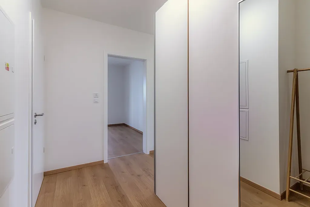 Byt nabízí příjemný obytný prostor s kuchyňskou linkou na míru a vestavěnými spotřebiči, samostatnou ložnici, koupelnu s vanou a pračkou, oddělené WC a praktické vestavěné úložné prostory v chodbě. Velkou předností jsou dva prostorné balkony celkem o výměře 16 m², přístupné z obytné části i z ložnice, které poskytují dostatek místa pro posezení i odpočinek. K bytu dále náleží sklep o velikosti 6 m² a garážové parkovací stání.