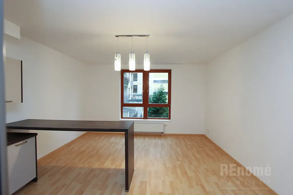 Z prostorné vstupní chodby, která je vybavena velkou vestavnou skříní je vstup do koupelny, samostatného wc, ložnice a obývacího pokoje s kuchyňským koutem. Kout je osazen plně vybavenou kuchyňskou linkou (sklo-keramická varná deska, horkovzdušná trouba, lednice s mrazničkou, myčka - vše zn. Bosch, mikrovlnná trouba zn. Samsung) + barový pult. Ložnice je vybavena velkou šatní skříní a psacím stolem.