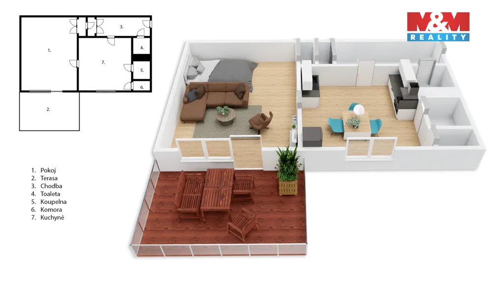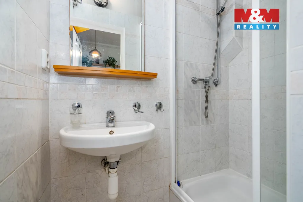 Dispozice bytu nabízí předsíň, samostatnou kuchyň, koupelnu se sprchovým koutem, praktickou komoru s přívodem vody a odpadem pro umístění pračky a obývací pokoj s odděleným spacím koutem a vestavěnou skříní.