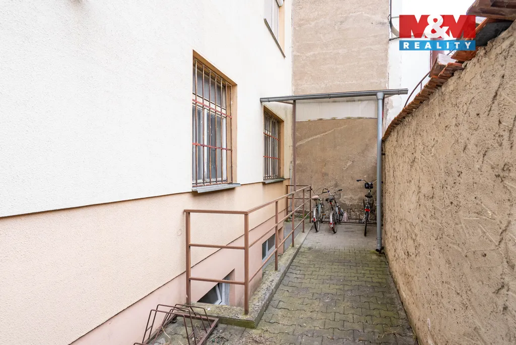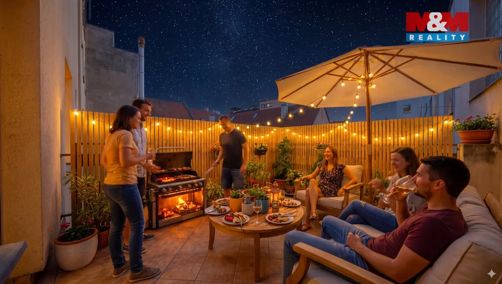 K bytu náleží terasa o velikosti 16,5 m², která je přístupná přímo z obývacího pokoje a je orientována na západ do klidného vnitrobloku. Součástí bytu je také velký sklep o ploše 10 m².