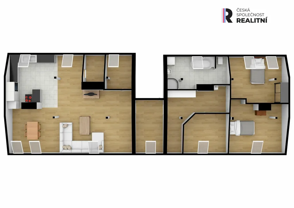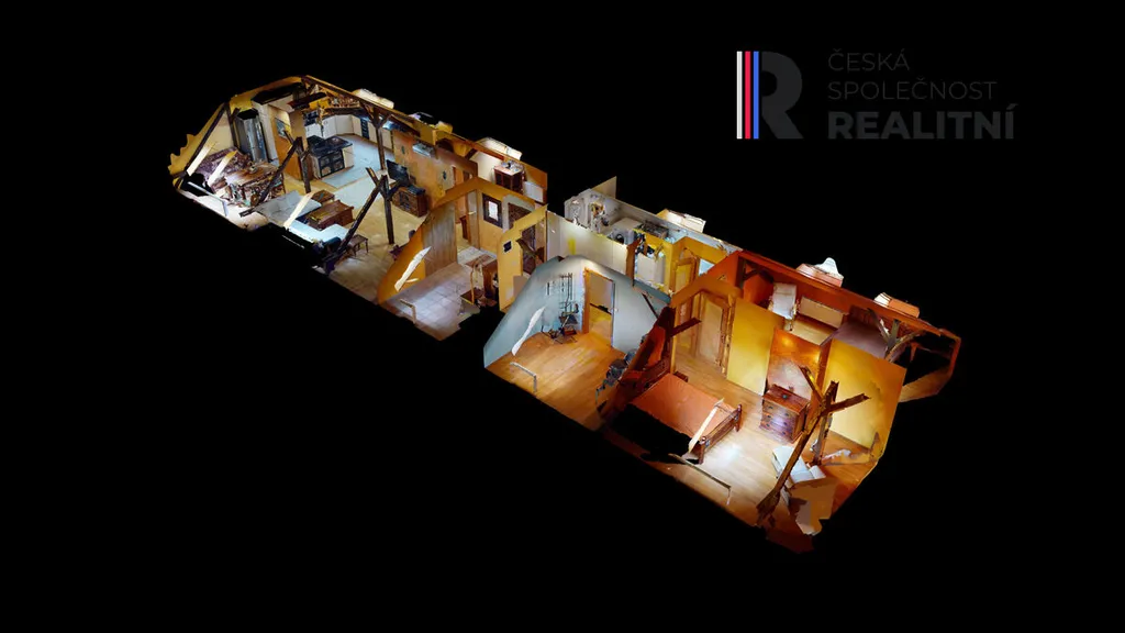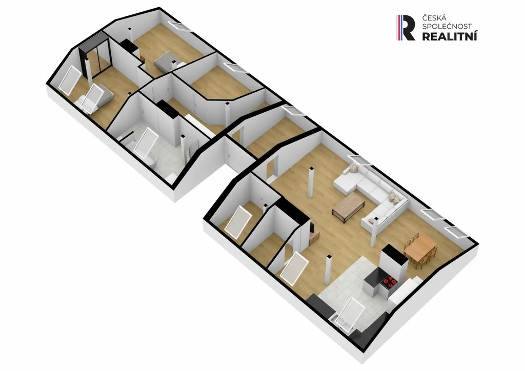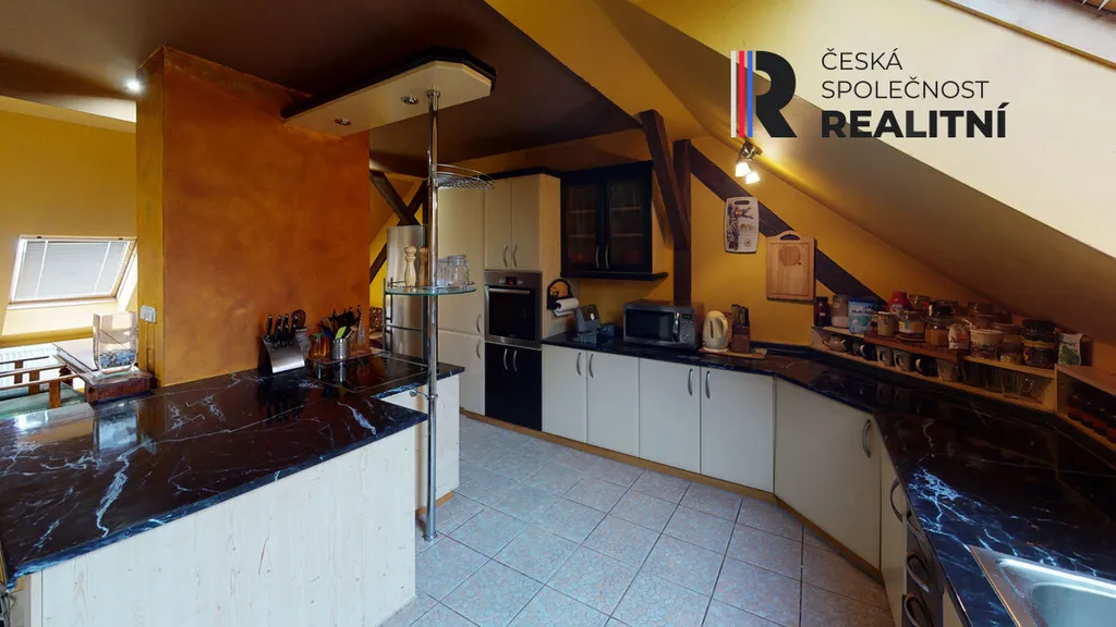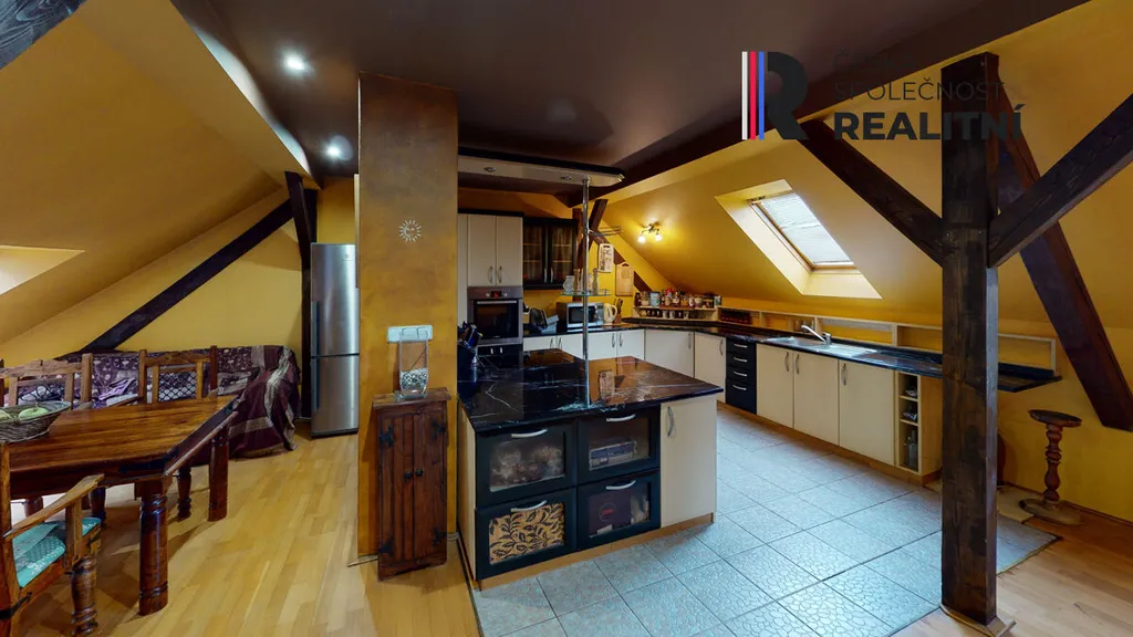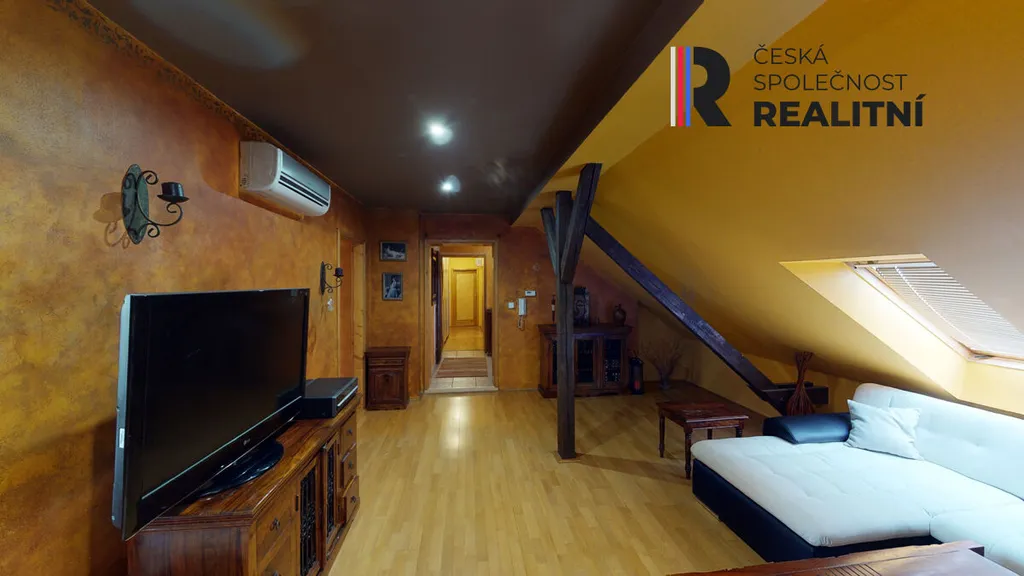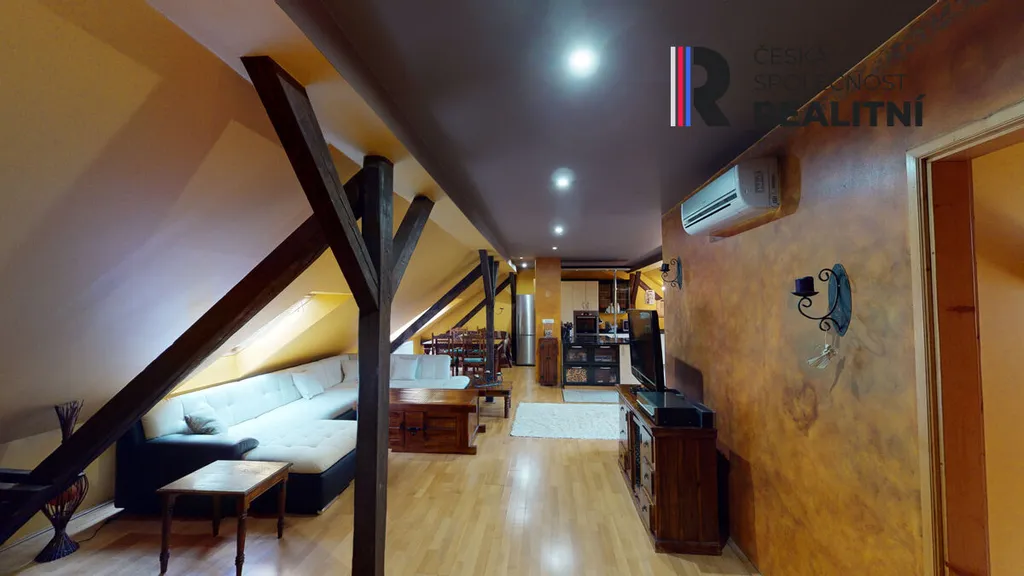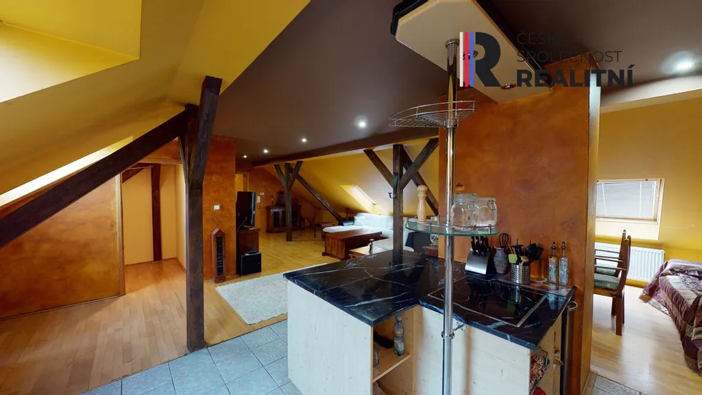 Byt vznikl vestavbou do půdního prostoru a zabírá celou délku domu, přibližně 24 metrů. Díky tomu nabízí netypické řešení prostoru a větší variabilitu využití jednotlivých místností. Dispozice je řešena jako 4+kk, přičemž jednotlivé části bytu na sebe navazují v podélném uspořádání. Prostor působí otevřeně a umožňuje případné úpravy dle potřeb nového vlastníka.