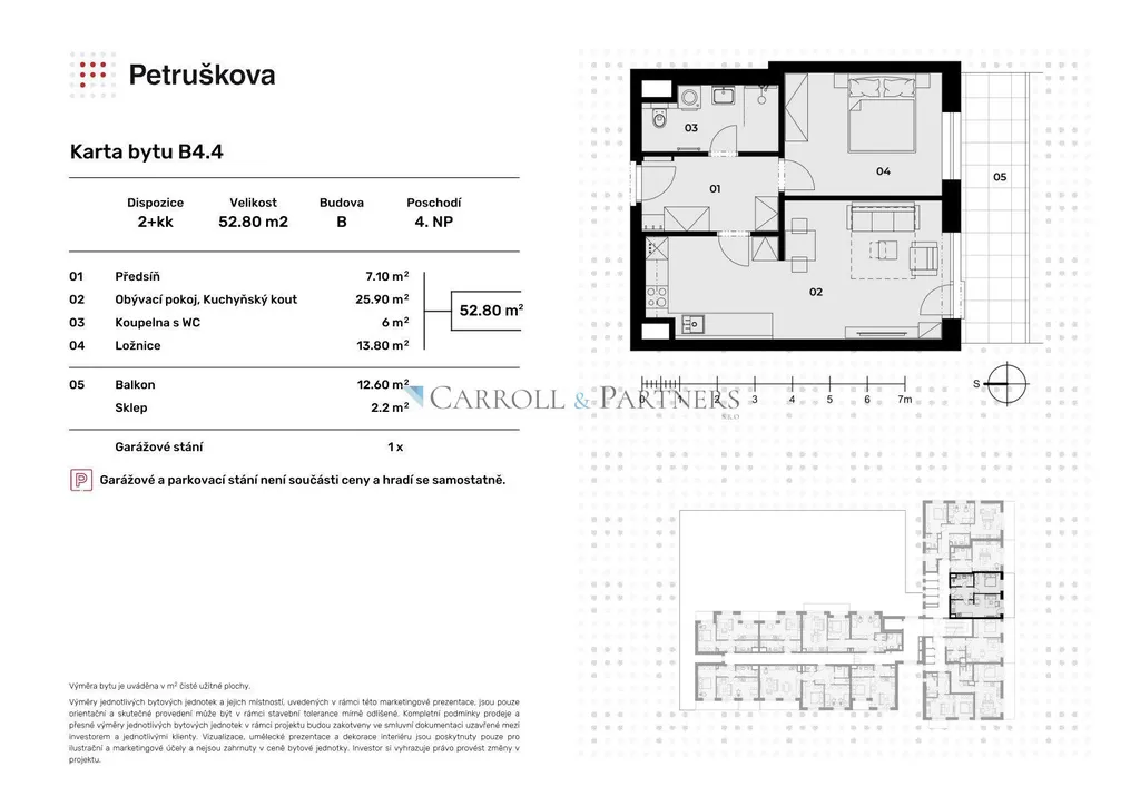 Byt B4.4 o dispozici 2+kk nabízí prostorný obývací pokoj s kuchyňským koutem a vstupem na balkon s výhledem do zahrady. Byt disponuje ložnicí a koupelnou se sprchovacím koutem. K bytu dále náleží sklad umístěný na patře a parkovací místo v garáži.