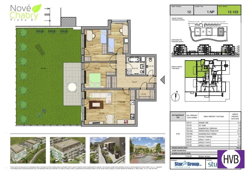 Nabízíme k pronájmu byt o dispozici 4+kk, o výměře 103m2 + předzahrádka 124m2, který se nachází v 1. NP novostavby Rezidenčního projektu Nové Chabry-Praha 8.