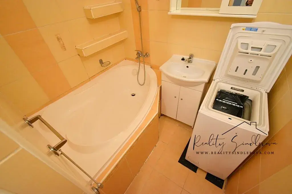 Bytová jednotka má zděné jádro, koupelnu s vanou (ne sprchovým koutem), WC dohromady s koupelnou, kuchyňská linka s vestavnými spotřebiči (plynová varná deska, elektrická trouba, digestoř. Lednice, myčka ani mikrovlnná trouba nejsou součástí vybavení.